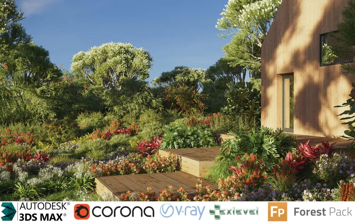 A collection of high-quality 3D flower&shrub models. Includes 14 species, total 126 models.<br/><br/>Formats: MAX | FBX<br/>Software | Plugin: 3Ds max 2012 |Forest Pack Pro 5.0 or above<br/>Renderers: Corona 1.6 | V-Ray 3.6 | Scanline or above<br/>Forest Pack Pro libraryYes<br/>GrowFX origin files: Yes<br/>Textures: Yes<br/>Materials: Yes<br/>UVW Mapped: Yes (Corona | V-Ray)<br/>Mesh: Yes<br/>Cover scene included : Yes/3Ds max 2014 or above (Corona Render only )<br/>Species<br/><br/>Baeckea virgata<br/>Banksia robur<br/>Banksia spinulosa<br/>Callistemon citrinus<br/>Cordyline rubra<br/>Dietes grandiflora<br/>Hymenocallis littoralis<br/>Ixora coral malay<br/>Lomandra fluviatilis<br/>Lomandra longifolia<br/>Melaleuca linariifolia<br/>Melastoma affine<br/>Philodendron xanadu<br/>Phyllanthus multiflora<br/>NOTE:<br/><br/>1.Support Forest Pack Pro library<br/><br/>All models are ready for Forest Pack Pro library. More features please visit itoosoft<br/><br/>2.GrowFX origin files.<br/><br/>2.1 With GrowFX origin files, you can easily create new shape of plants by set new seed. Or change shape as you needed.<br/><br/>2.2 Create wind and grow animate of plants easily.<br/><br/>2.3 React or Cut out with objects in scene, you can created the shape just fit your scene.<br/><br/>2.4 More features please visit exlevel