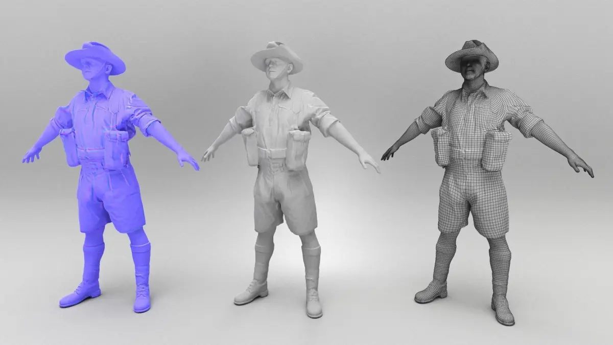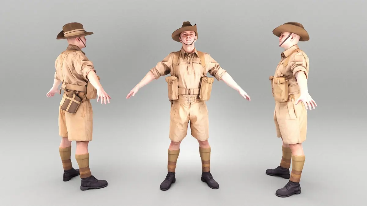 This is a true human size and detailed model of a Australian infantryman character from 1940s. All props and suit are original. The model is captured in the A-pose with mesh ready for rigging and animation in all most usable 3d software.