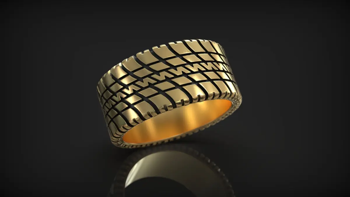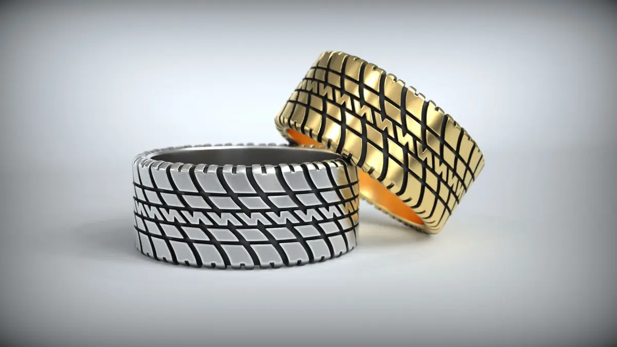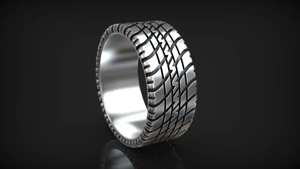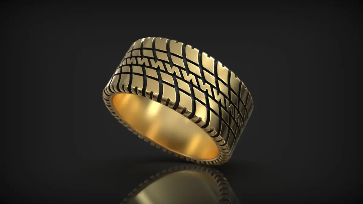 This high-quality 3D model represents a bold and stylish tire tread band ring, available in gold and silver finishes. The ring design mimics the distinctive pattern of a car tire, making it a perfect symbolic piece for automotive enthusiasts, bikers, or anyone who loves edgy, industrial design.