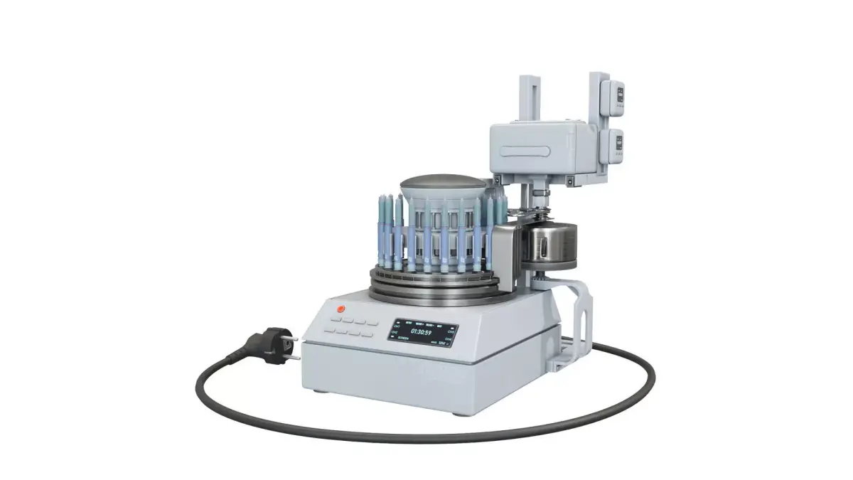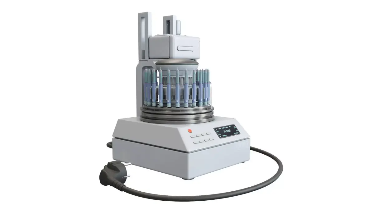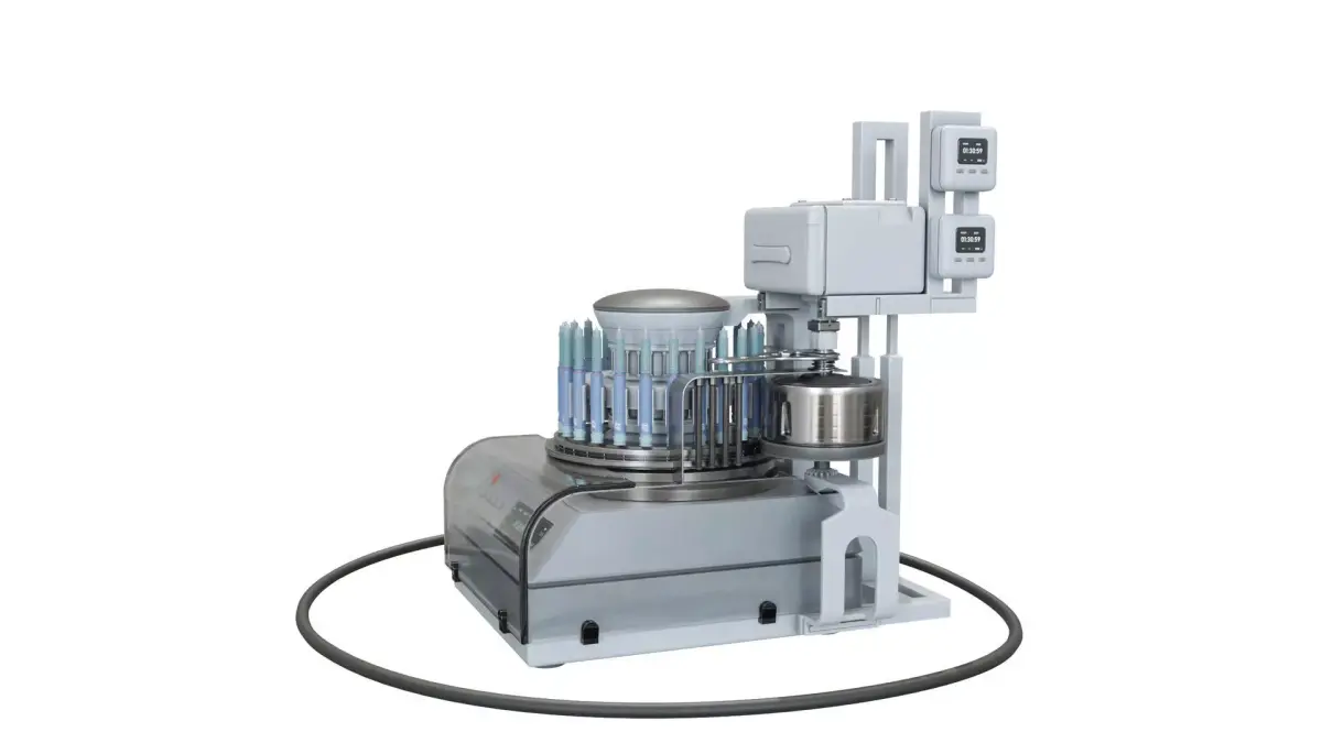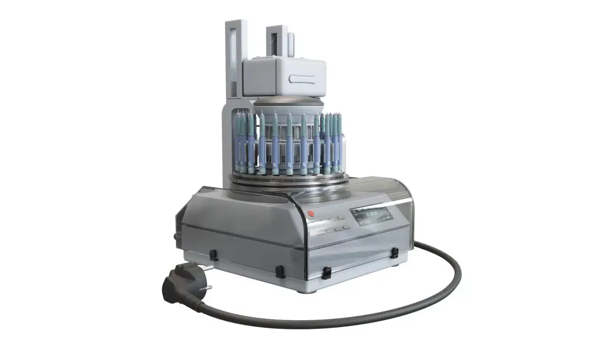 This system is a high-precision automated testing station designed for quality control of insulin injection pens during manufacturing. It features a vertical rotary table that indexes each pen through multiple test stations, including dose accuracy verification, leakage inspection, injection force measurement, and mechanical function checks. The rotary table allows for continuous, high-throughput testing in a compact footprint, improving efficiency and ensuring consistent product quality in pharmaceutical device production.