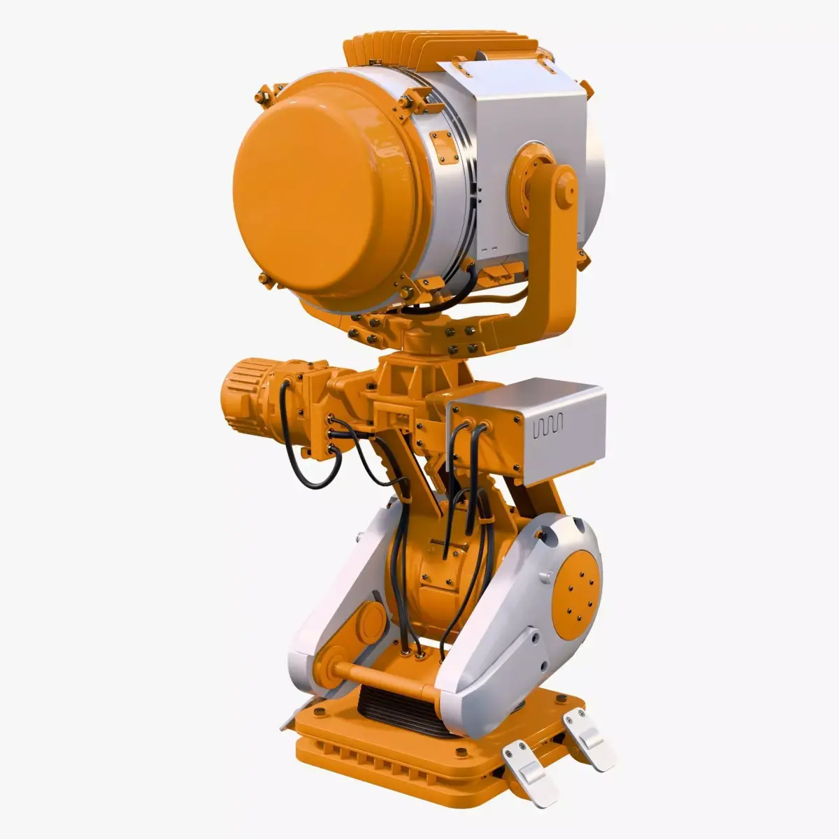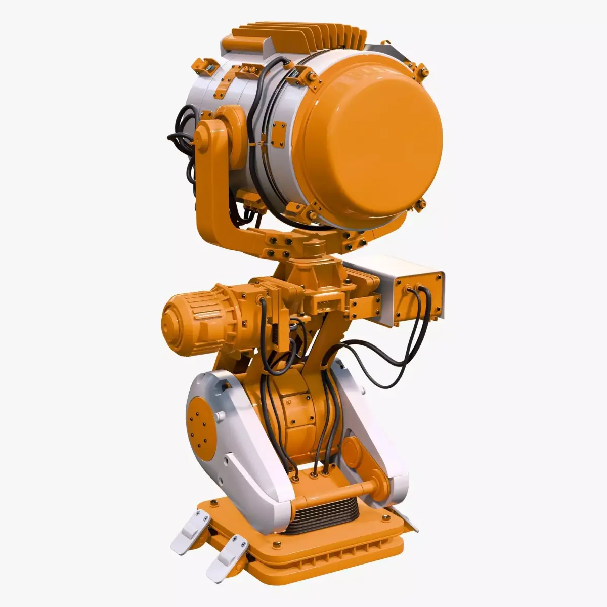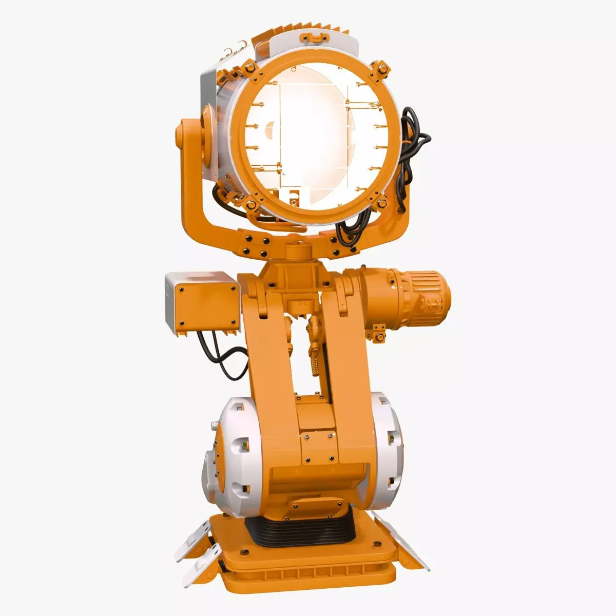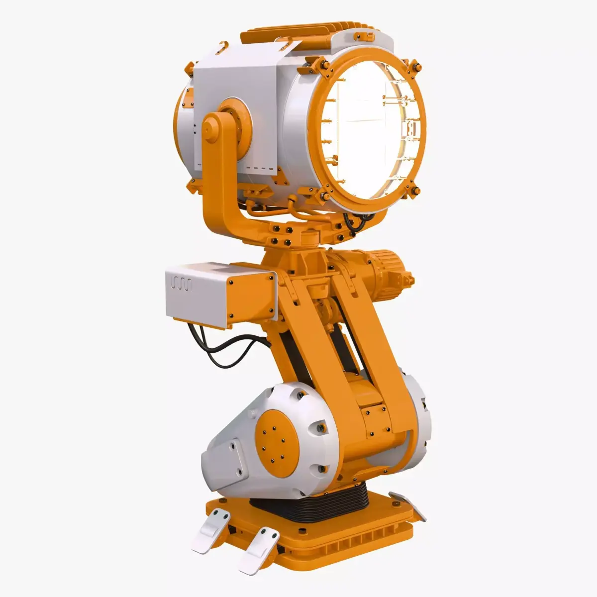 Powerful automated searchlight mounted on a complex robotic turret. The design features a heavy industrial style using signal orange. The device head is equipped with signal shutters and a massive cooling radiator on top. The movable base consists of a system of mechanical levers and actuators that enable the searchlight to rotate and tilt.