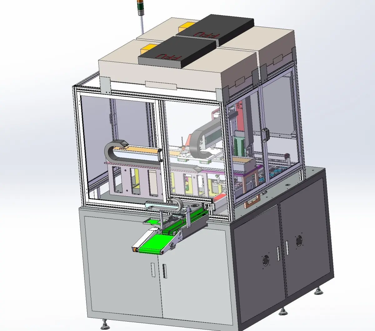 Automatic assembling of touch screen, this machine is used to assemble the touch screen of electronic products, which is made up of automatic assembling of mechanical hand and small materials on the assembly line by taking pictures of CCD