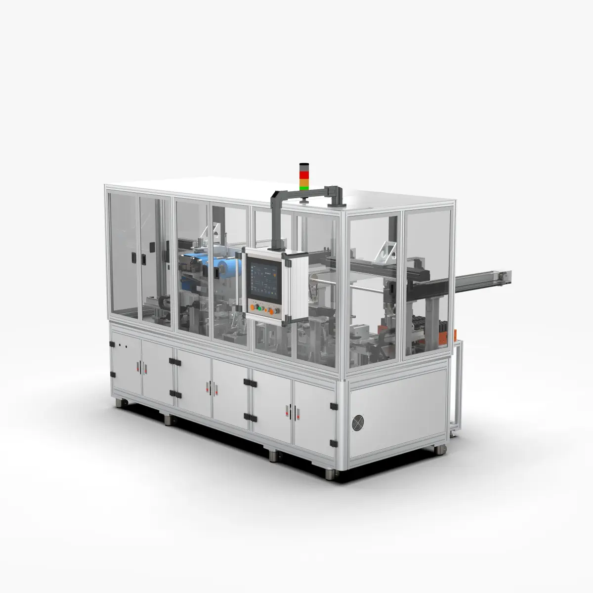 Battery tray type loading and unloading coating machine This equipment is a power battery coating, folding, size measurement, integrated automation equipment. The material is stored in a tray and picked up by a manipulator. By controlling the tension of the insulating film and the speed, hardness and pressure of the roller to ensure that the insulating film sticks to the surface around the cell; the rubber roller mechanism is pushed by the cylinder to complete the folding and sticking of the insulating film. After completion, use the manipulator to put back the blanking tray.