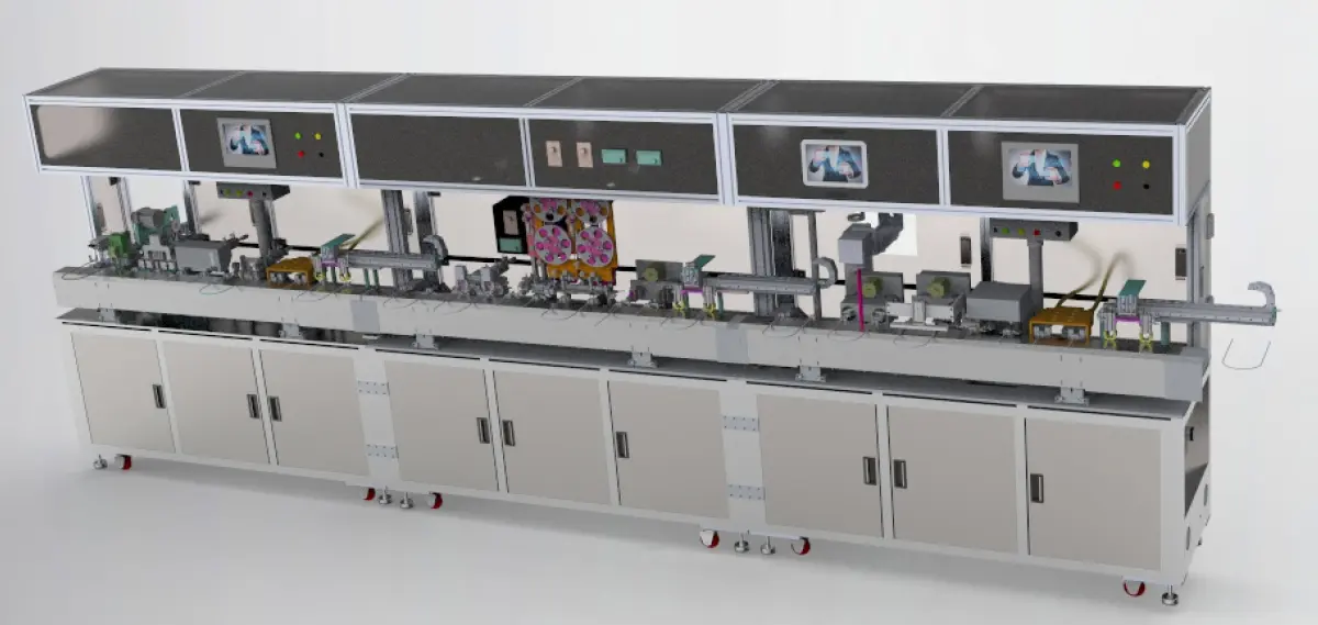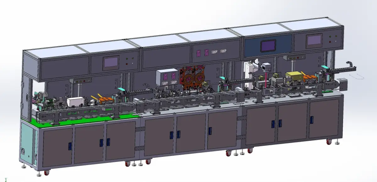 This equipment is a production line, through the wire automatically feeding, bending into the demand wire, through cutting, stripping of different processes, copper foil paper welding, wrapping, forming the whole line of processing and packaging line operations.The equipment is a set of automatic wire production equipment, equipment can be raw coil from wire production to processing finished products.The equipment through the chain transmission mechanism, midway without personnel operation can form automatic production, the overall degree of automation is very high, is a good reference for the design and production of different equipment and technology.