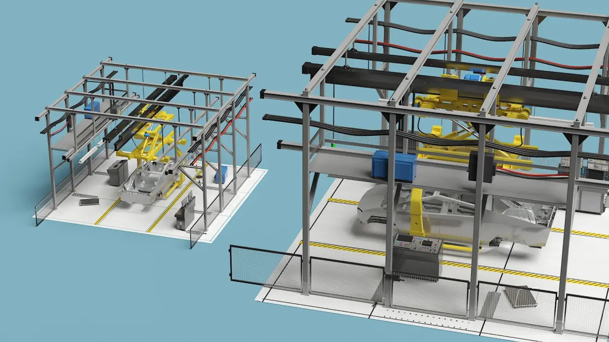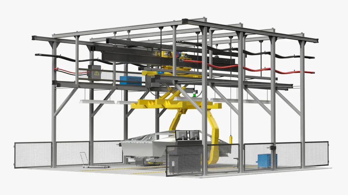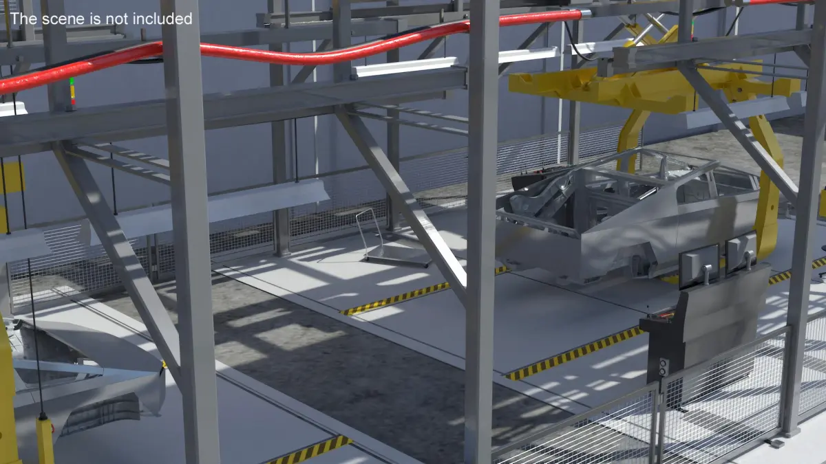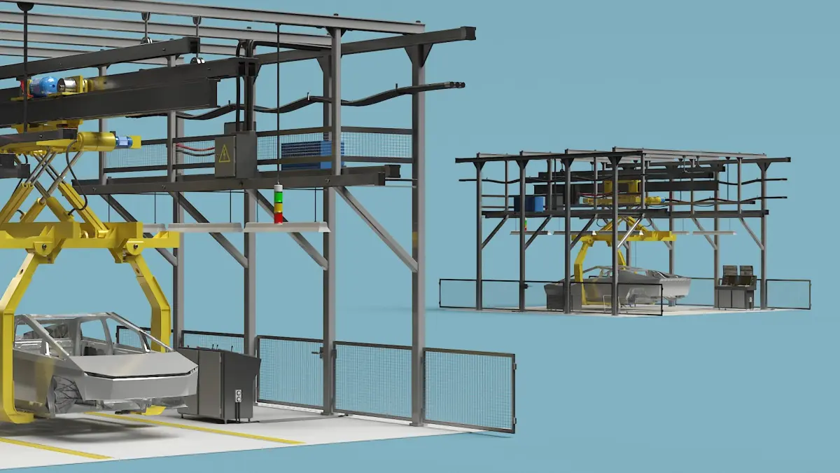 This model showcases an assembly line equipped with scissor lift constructions, ensuring efficient and precise handling of Cybertruck body components. The lifts facilitate smooth vertical movements, optimizing the production process. The system emphasizes stability and adaptability, supporting the unique structure of the Cybertruck during assembly.