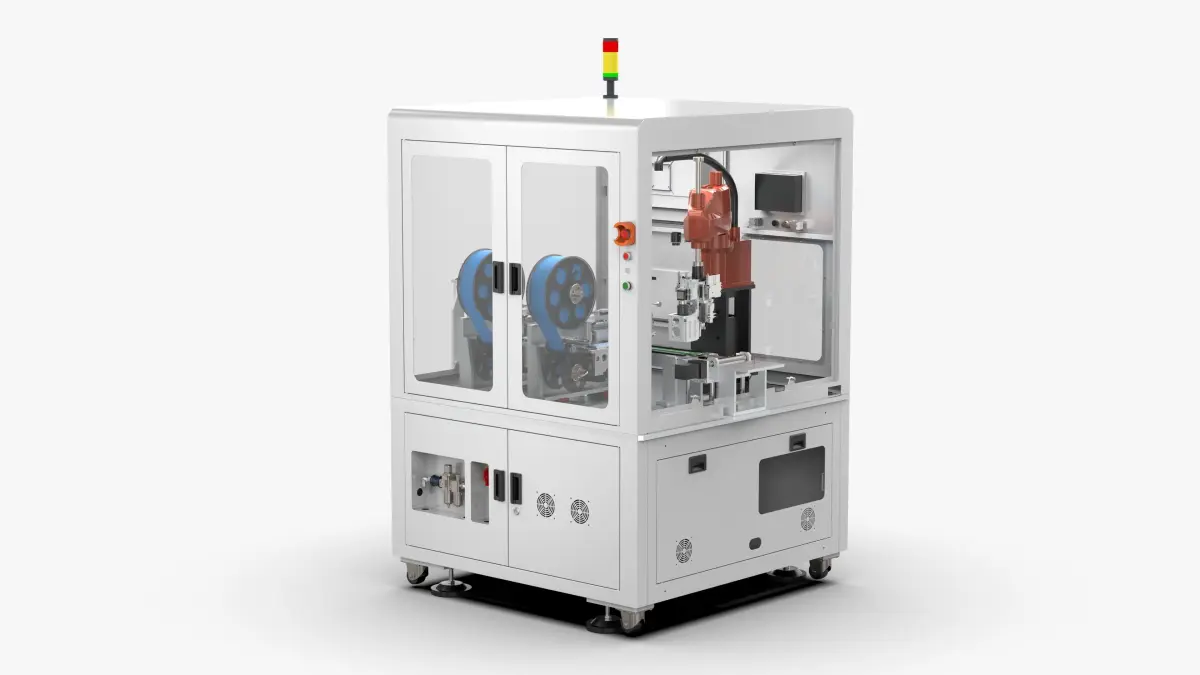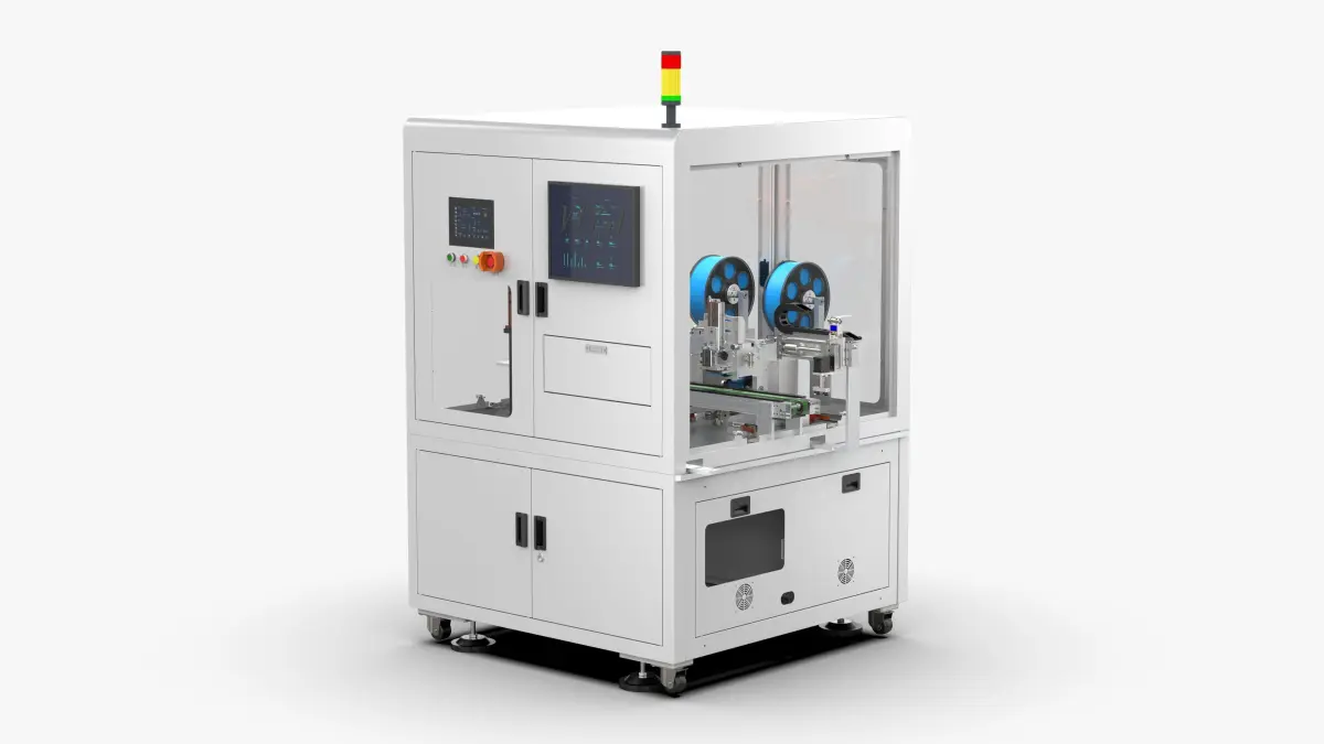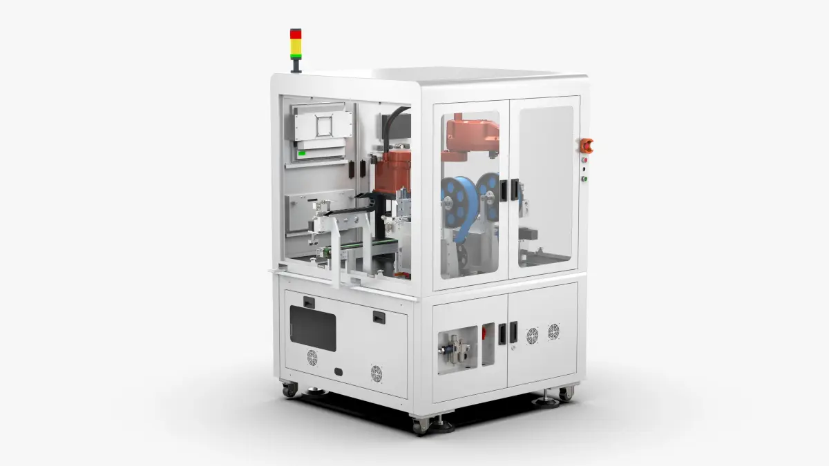 The equipment is double-feeder online labeling equipment. In the production of some products, labeling processing is required. The carrier flows into the equipment, jacked up and positioned, and the label-taking mechanism takes the label. The equipment contains two feeders inside, which can Compatible with labeling of different products, after labeling, the manipulator puts the product into the turning mechanism.