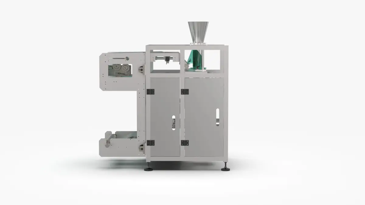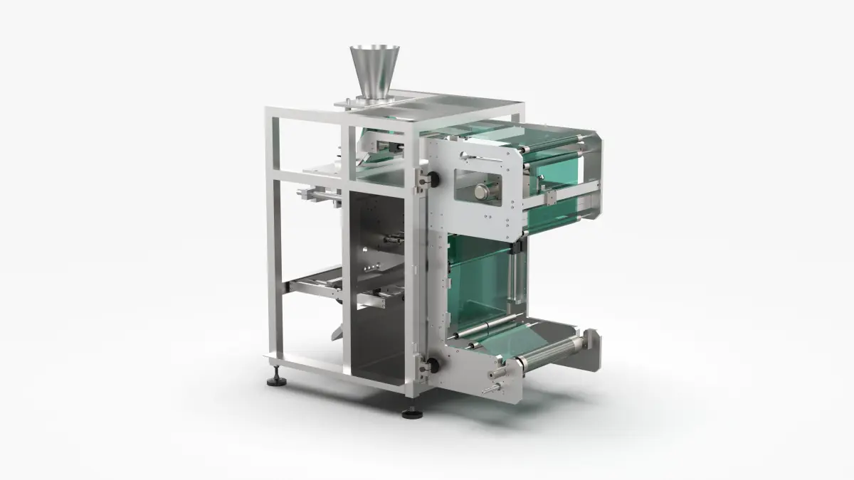 A three-dimensional drawing of a small bag packaging machine for food, medicine, chemical products and other particulate matter. During the packaging process, the material is fed by a stretching feeding device. The plastic film is formed into a cylindrical shape through a film cylinder, and sealed by a heat longitudinal sealing device. Live on the side to complete the package.