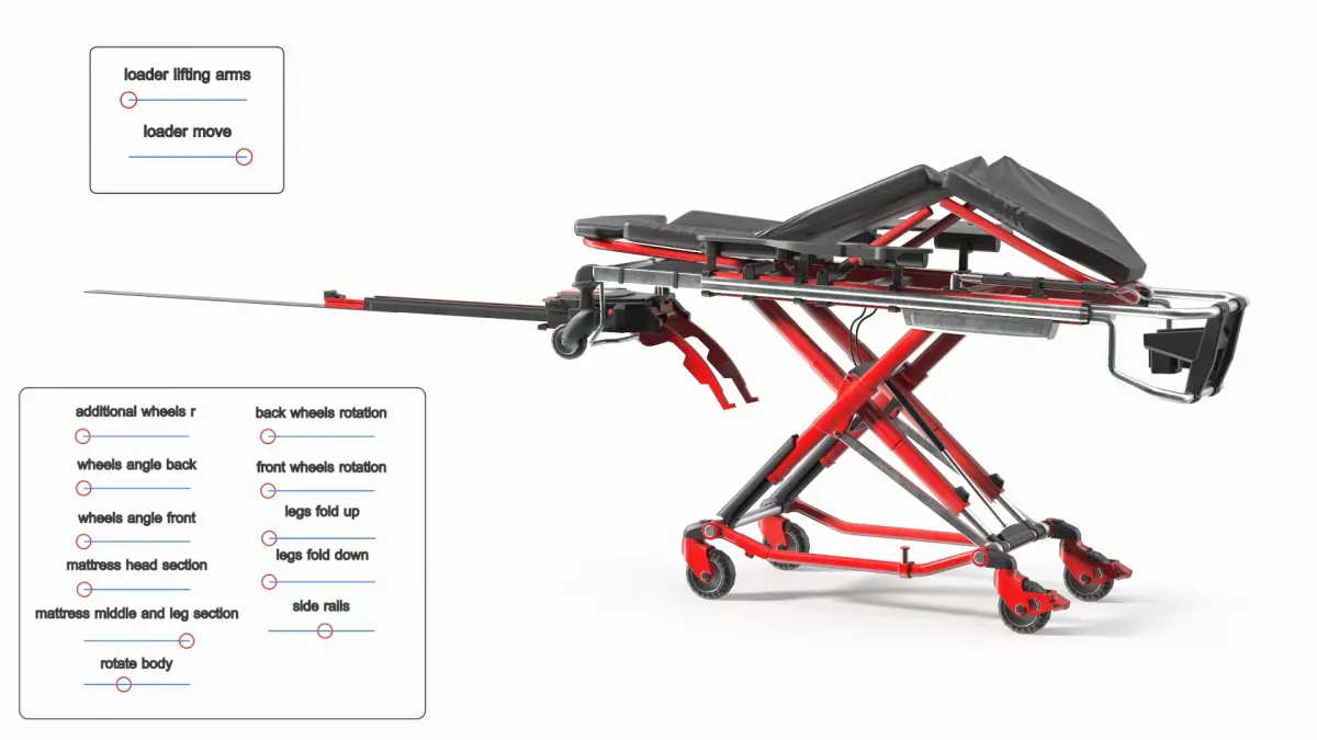 Automatic Medical Cot With Loading Guide Black Red Rigged is fully rigged and is ready to be animated. You can easily position it the way you need or animate it the way your project requires using helpers in 3D Studio Max. See the turntable to get an idea of how rigging works.