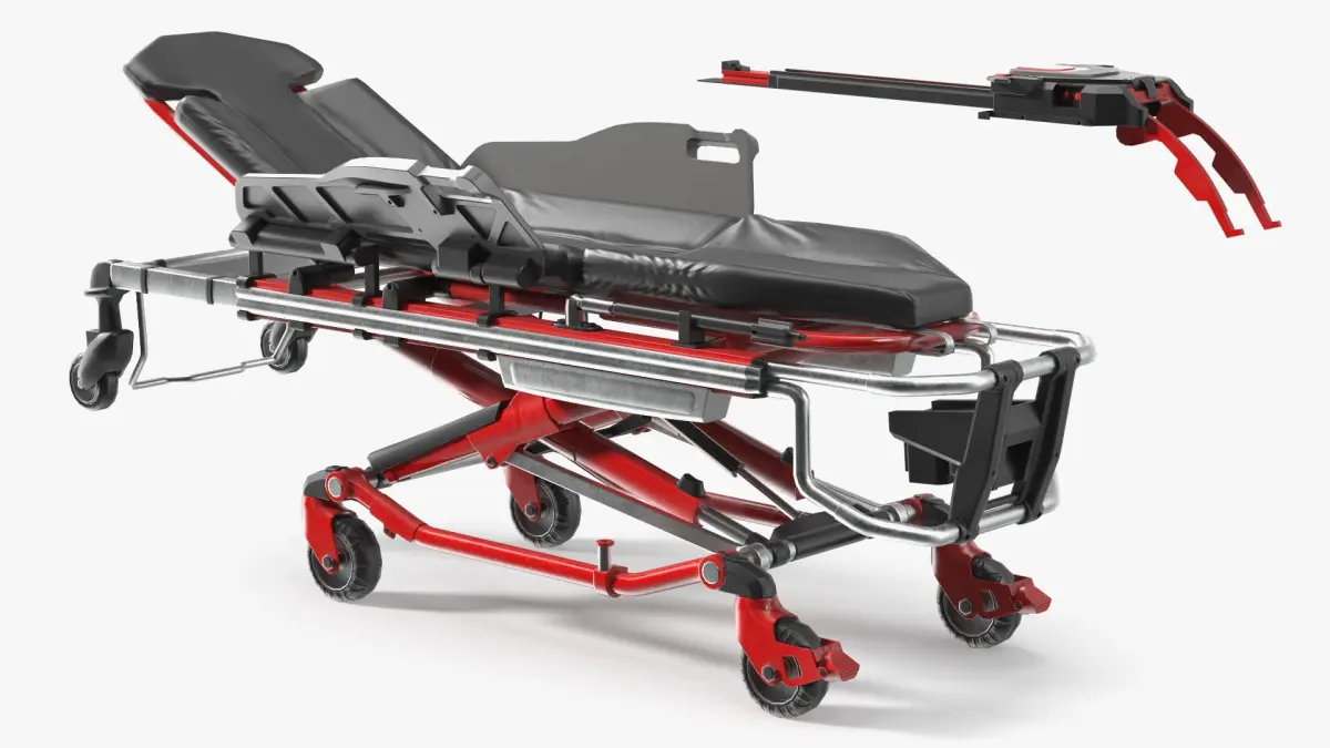 Automatic Medical Cot With Loading Guide Black Red Rigged is a three-dimensional model of modern hospital patient load and moving apparatus with an electrical powered lifting mechanism.