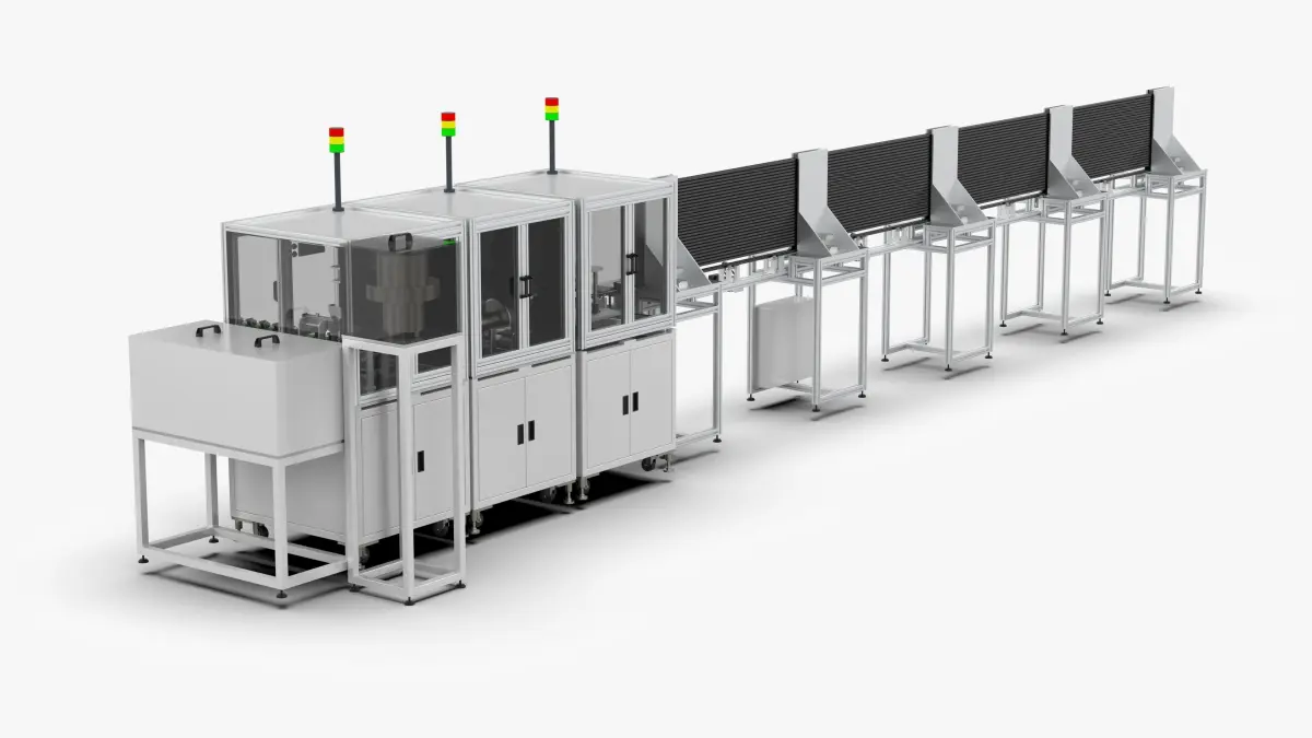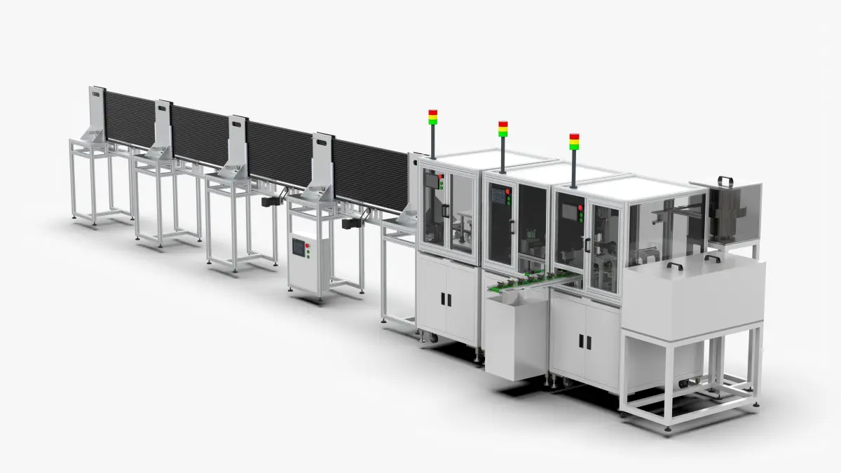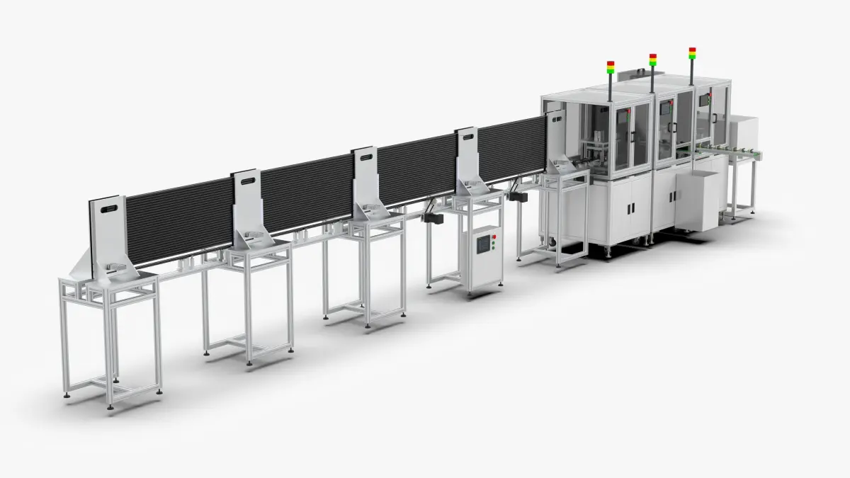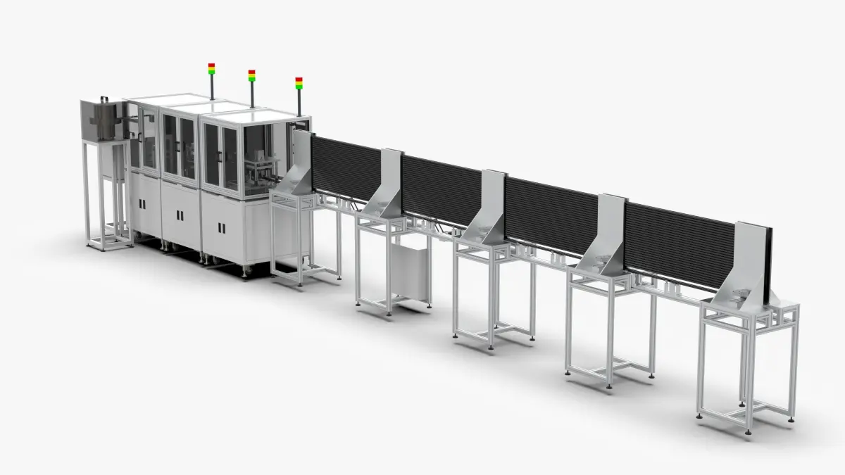 In order to facilitate the operation and maintenance of the machine, the profile cutting punching fastener assembly line equipment (including PPT) specially designed the workbenches of punching equipment, cutting equipment and assembly equipment at a uniform level; punching equipment, cutting equipment and assembly equipment The appearance and size of the three devices are the same, which enhances the neat and beautiful appearance of the production line; the lower cylinder first extends, and the upper cylinder returns, and the product will fall on the feeding partition; the lower cylinder returns, and the bottom product will fall on the subsequent on the moving wheel, and then the motor drives the product to feed.
