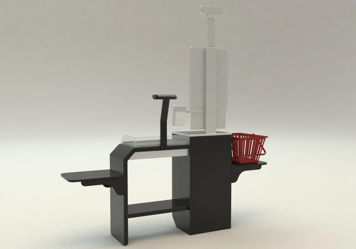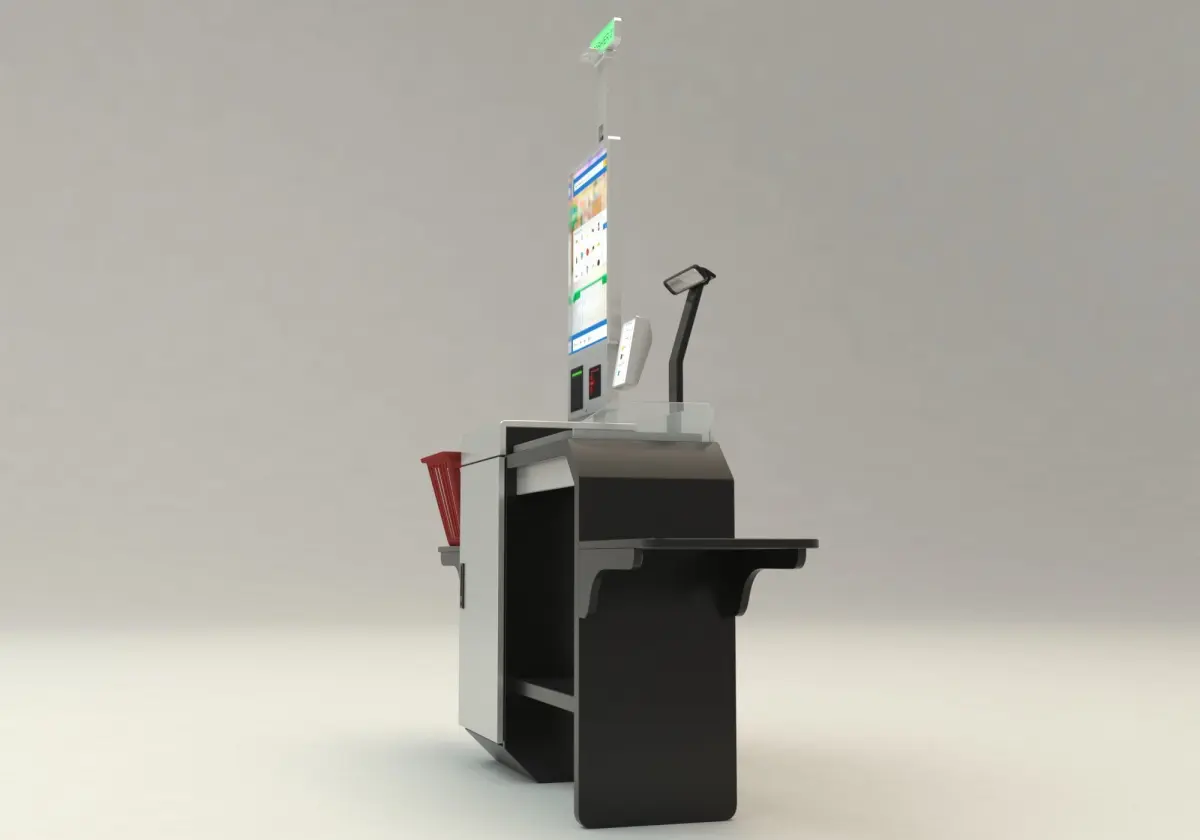 Humanless self payment system, autmatic shopping cashier 3d model.3D model dimensions are: 220 cm. Lenght. 55 cm. Depth. 231 cm Height.