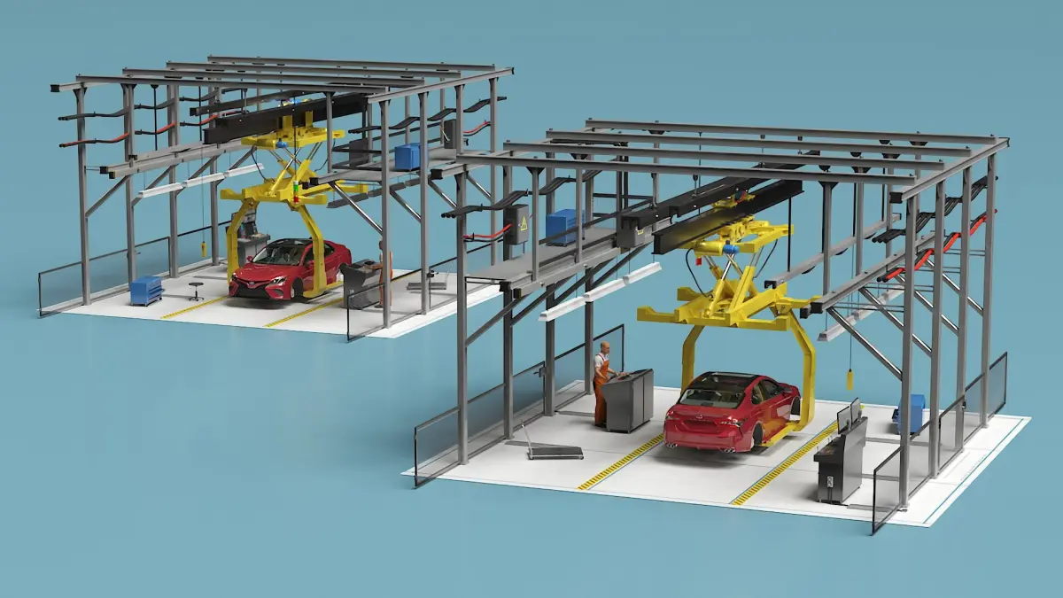 An automatic vehicle assembly line moves car parts along a conveyor to various stations where automated tools perform tasks such as welding, bolting, or painting. This system streamlines production by continuously assembling multiple cars in stages, ensuring uniformity, speed, and cost-efficiency in automotive manufacturing.