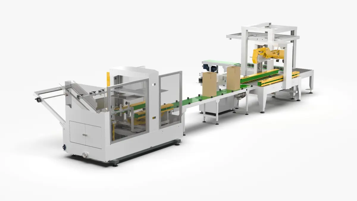 This drawing is the product unpacking and sealing scheme of a large audio manufacturer. The equipment includes a box unpacking machine, which is fully automatic, a box sealing machine, a labeling machine, etc., and the structure is relatively complete.