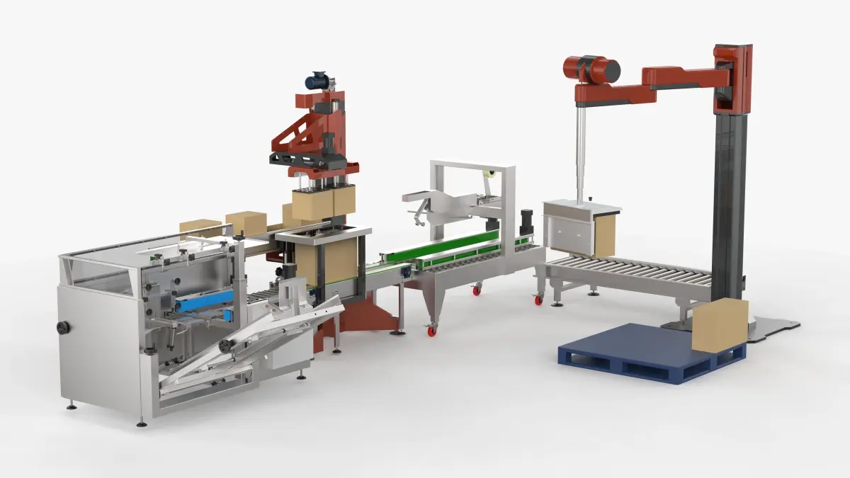 This drawing is the unpacking and sealing scheme of a food factory. The content is complete, including sheet unpacking machine, power roller, carton opener, packing robot, etc.