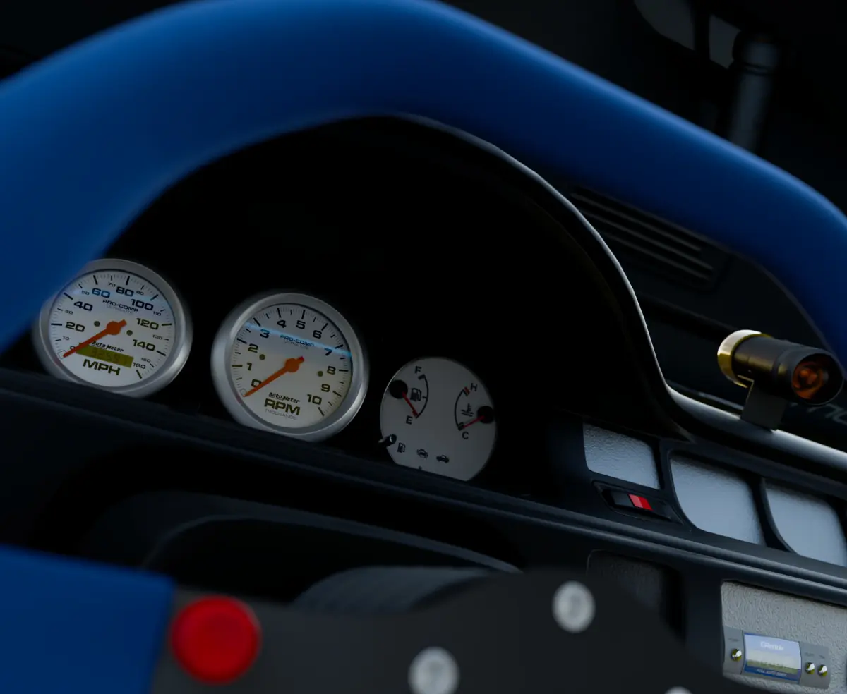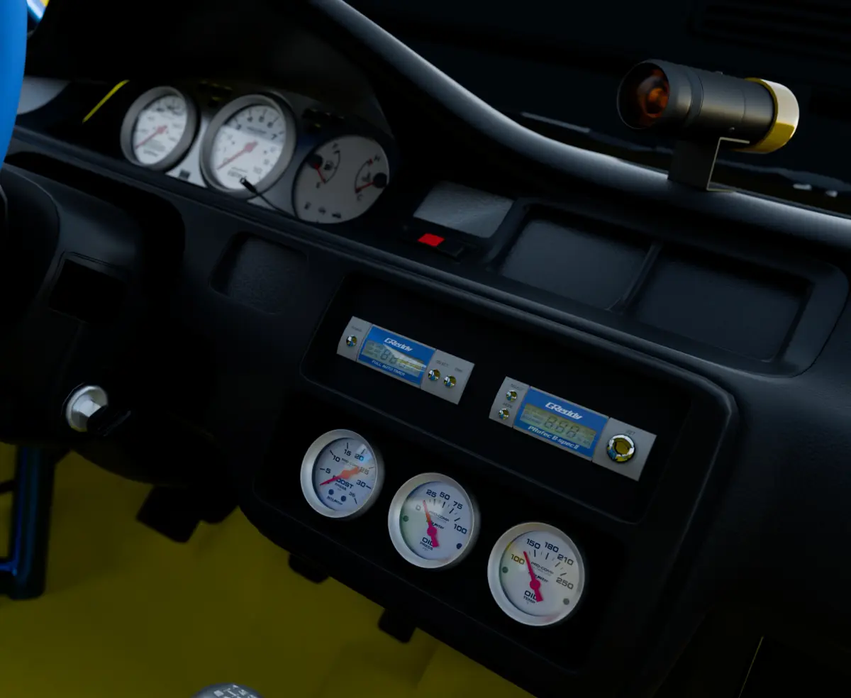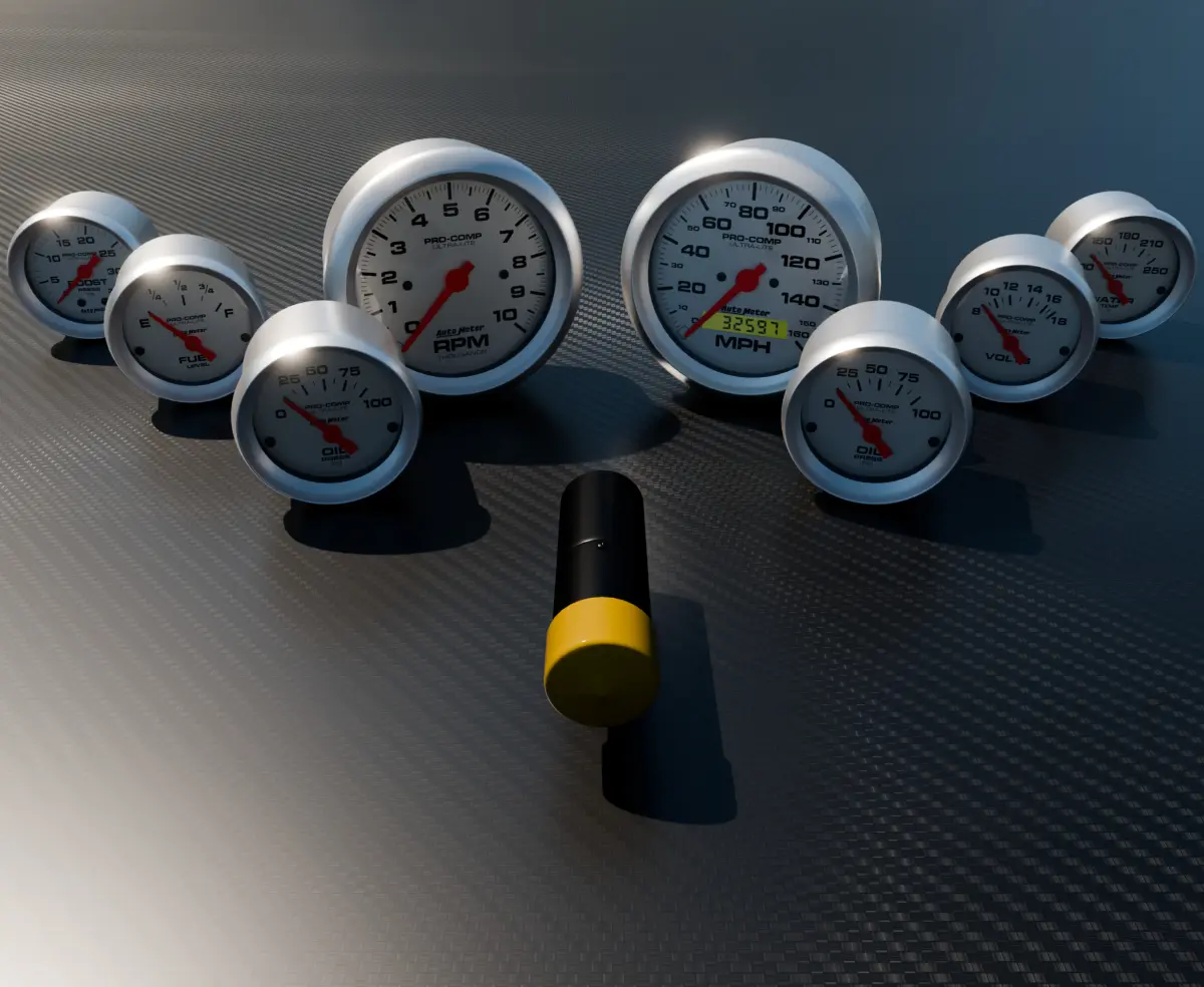 This pack contains 8 different gauges, 2 being 86mm big and 6 being 52mm small. Included is a matching shift light that can be customized and also be combined with the RPM gauges. The gauges do not have a modelled back, so if you want them to be exposed, you will have to model the rear part of the case and the wires.