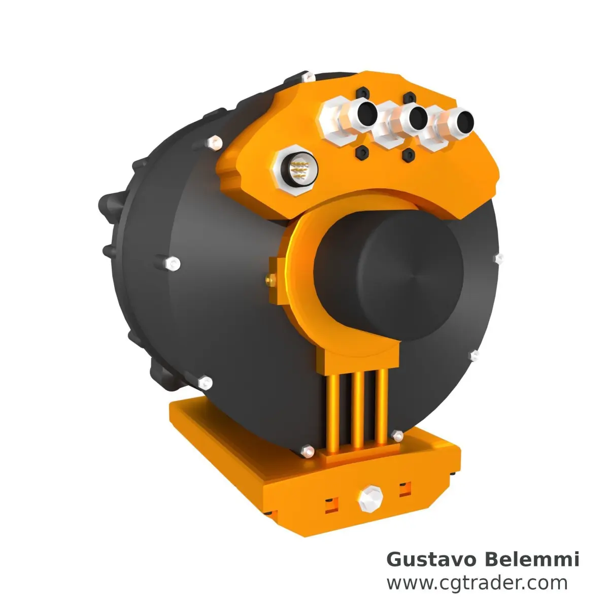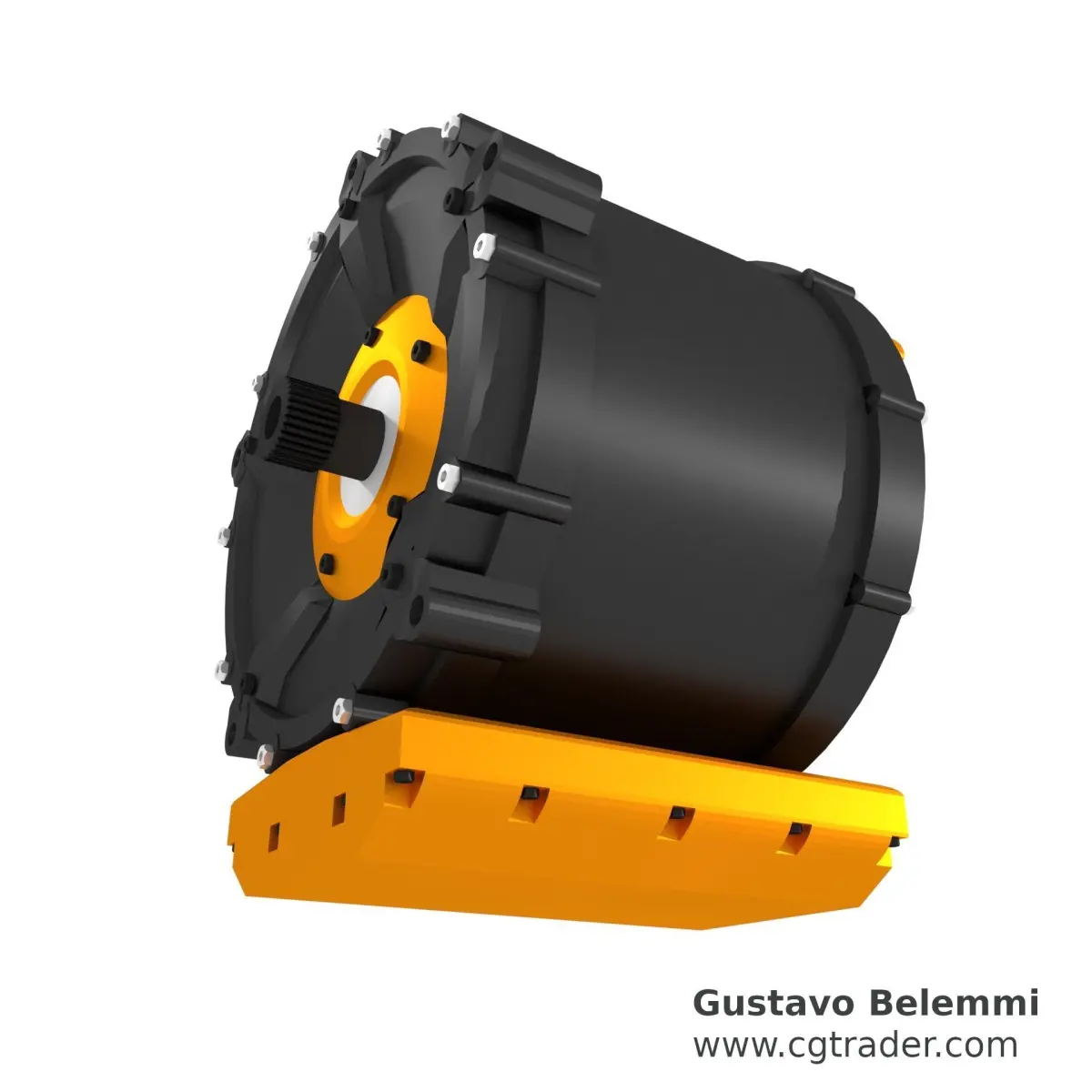 3D model of a electric motor with great torque and power, designed for automotive use. It works with alternating current and with a high voltage. It is an induction motor (brushless) with permanent magnets. It is quite similar to the classic electric motors used in sedan and racing vehicles. Also, it has measurements and proportions quite similar to that of a real electric motor of this category. It has cooling by water and oil.