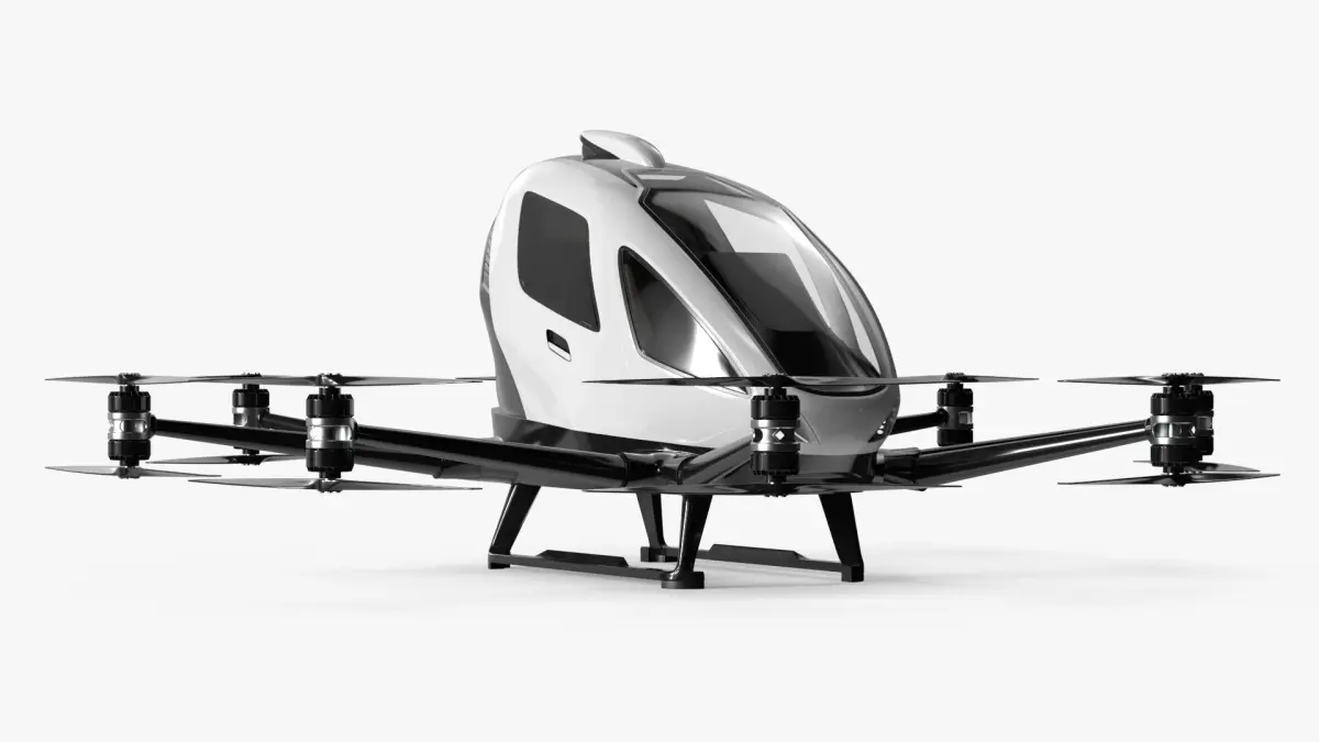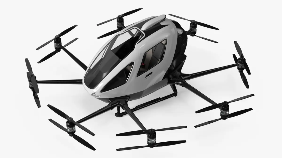 This model features a sleek, aerodynamic design with multiple rotor blades for vertical takeoff and landing. Its compact cabin is crafted for passenger comfort and safety, incorporating advanced navigation systems and sturdy materials. The model highlights the potential of drones in revolutionizing city transport, providing an eco-friendly and efficient alternative.