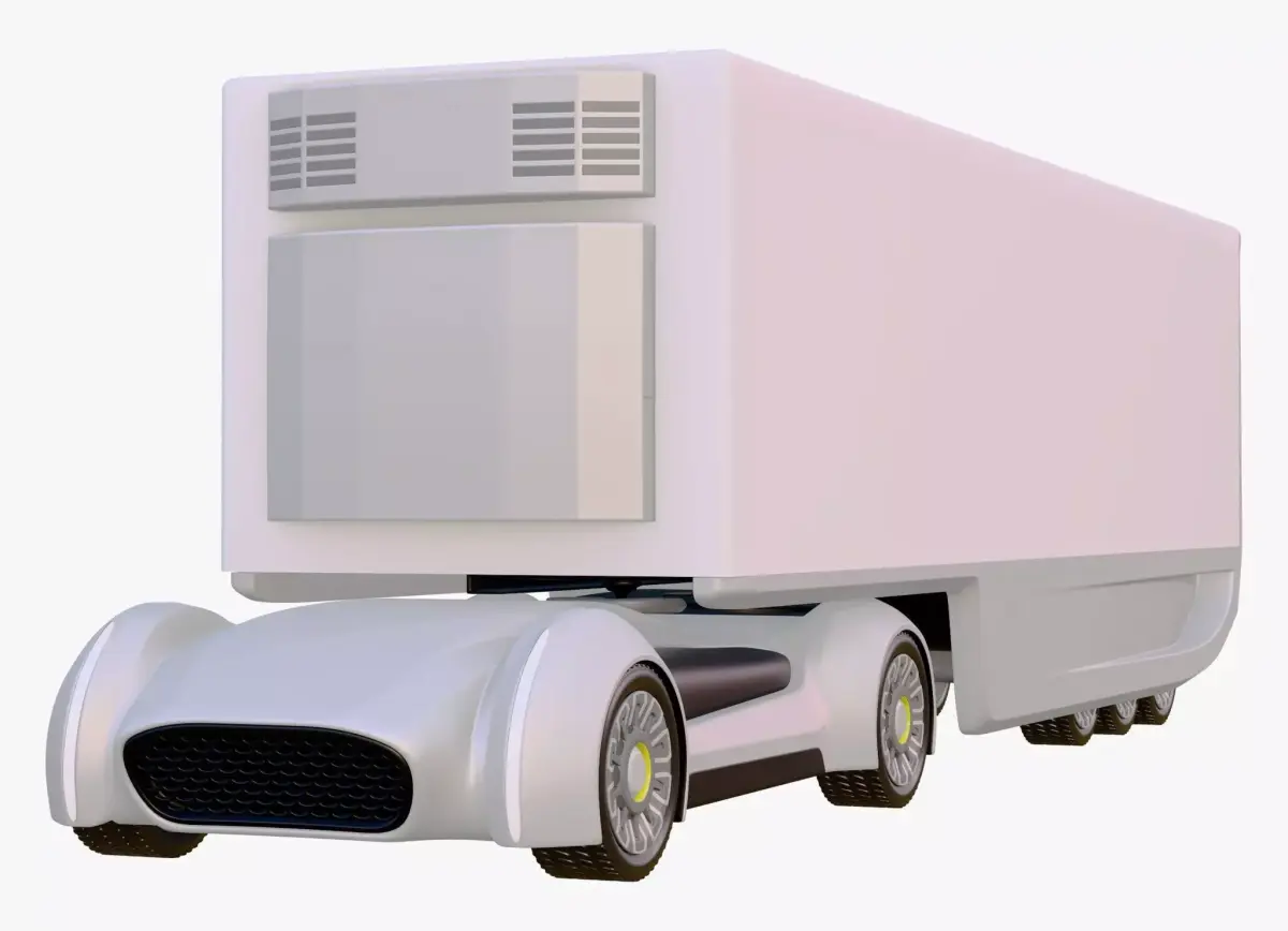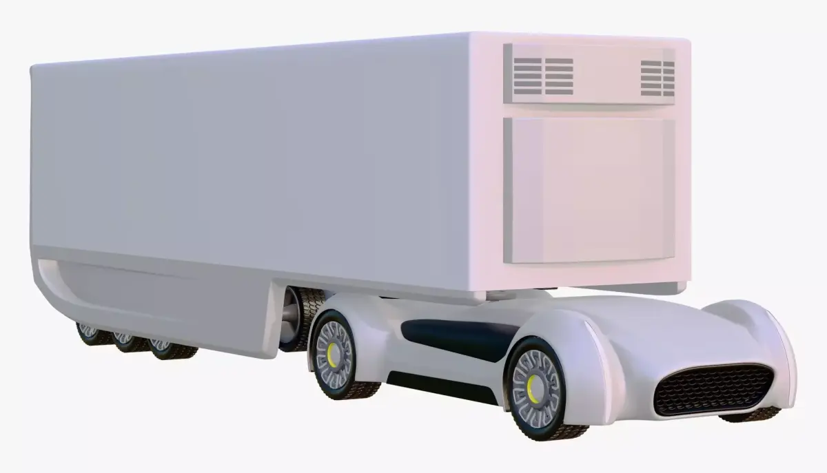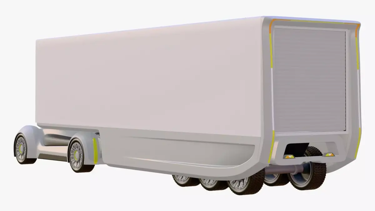 Autonomous electric cargo truck concept. The design pairs a low-profile unmanned truck with a honeycomb grille and an aerodynamic refrigerated trailer, featuring side skirts and a rear roll-up shutter.