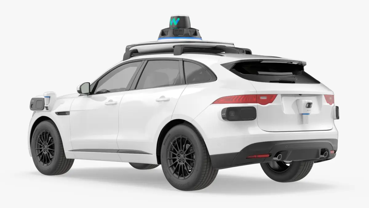 The model features sensors and cameras mounted on a sleek SUV platform, highlighting the technical advancements in driverless technology. Its design includes a high-tech sensor suite that ensures robust safety and navigation in various environments.