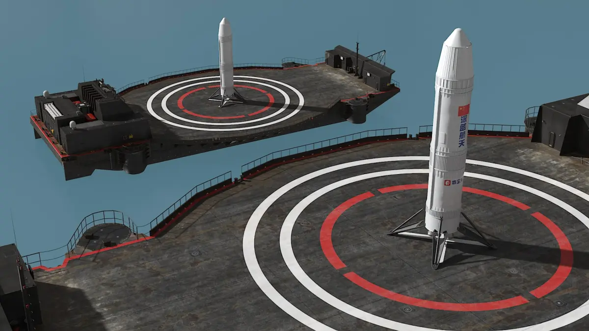 Autonomous Vessel for Rocket Landings and Nebula 1 Rocket is a 3d model of a specialized platform or vehicle designed to autonomously capture or assist in the landing of rockets, particularly those that are reusable.