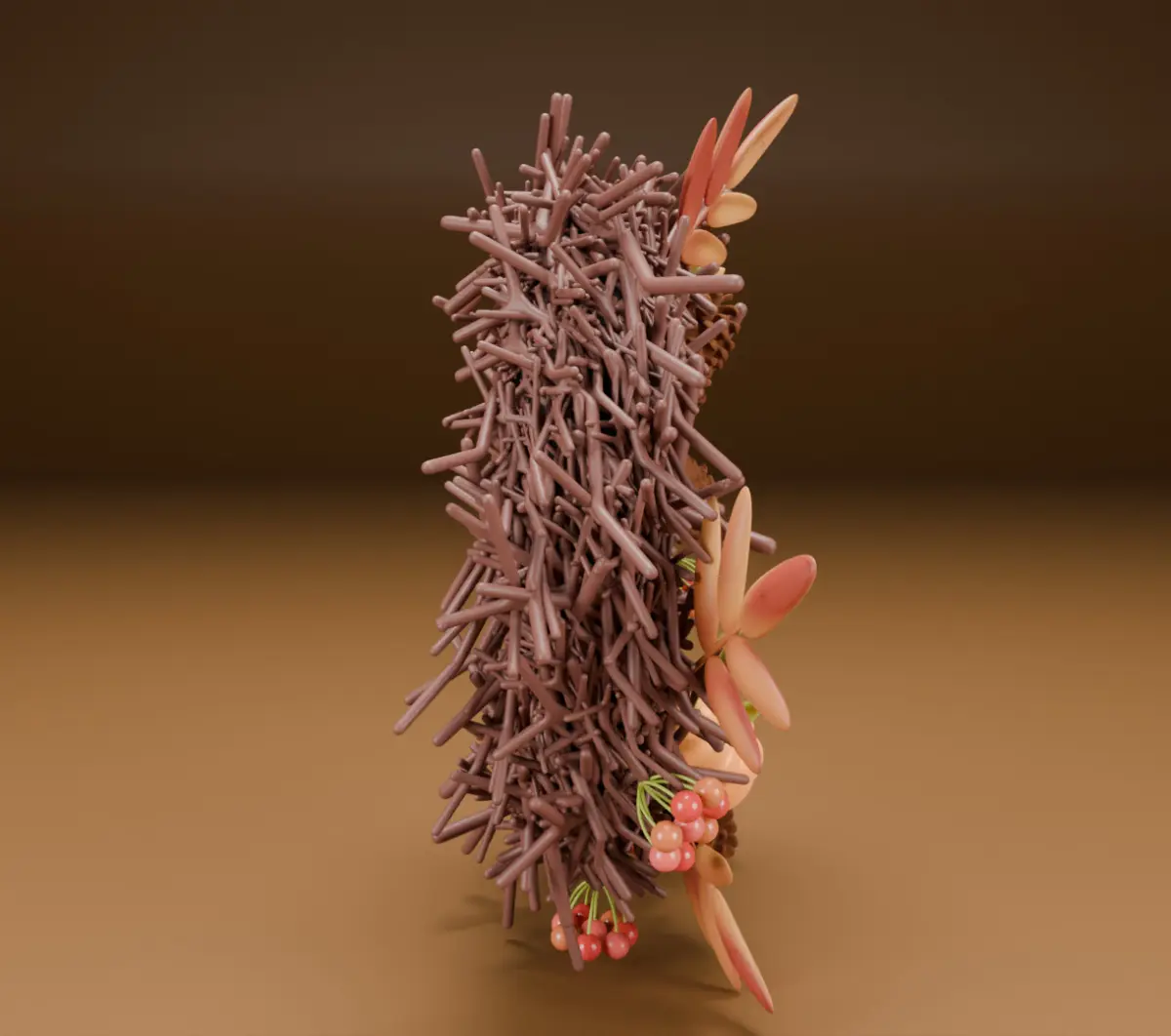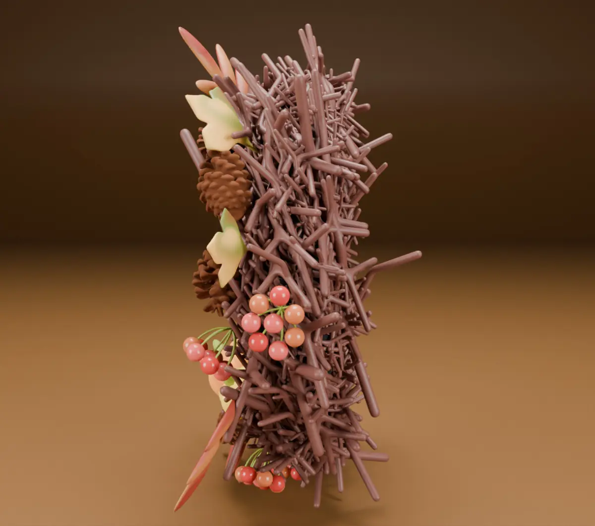 This high-quality 3D wreath is inspired by the cozy atmosphere of autumn. Elegantly modeled branches form a natural base, adorned with detailed elements — ripe pumpkins, pine cones, rowan berries, and leaves in warm yellow-orange shades. The composition reflects the natural harmony of an autumn forest and is ideal for interior visualization, festive scenes, or game content.