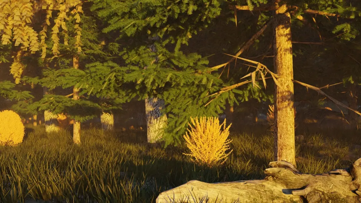 An autumn forest scene containing well-detailed objects, fallen leaves on the ground, grass, pebbles and large stones, 3 types of trees, bushes and stumps. The scene is made using particle systems. The ground uses a 4K texture, using displacement.