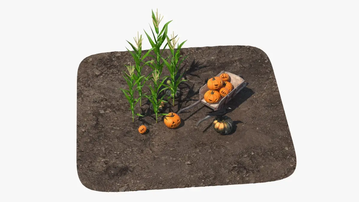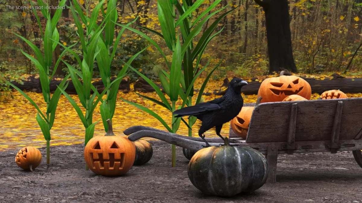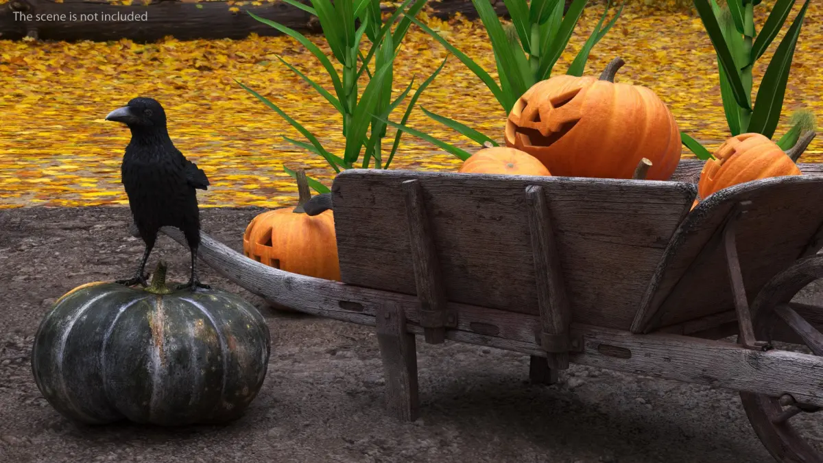 Autumn Harvest Setup with Pumpkins and Crow is a three-dimensional model of autumn-themed setup featuring corn stalks, pumpkins, a wooden cart (old wheelbarrow), and a crow.