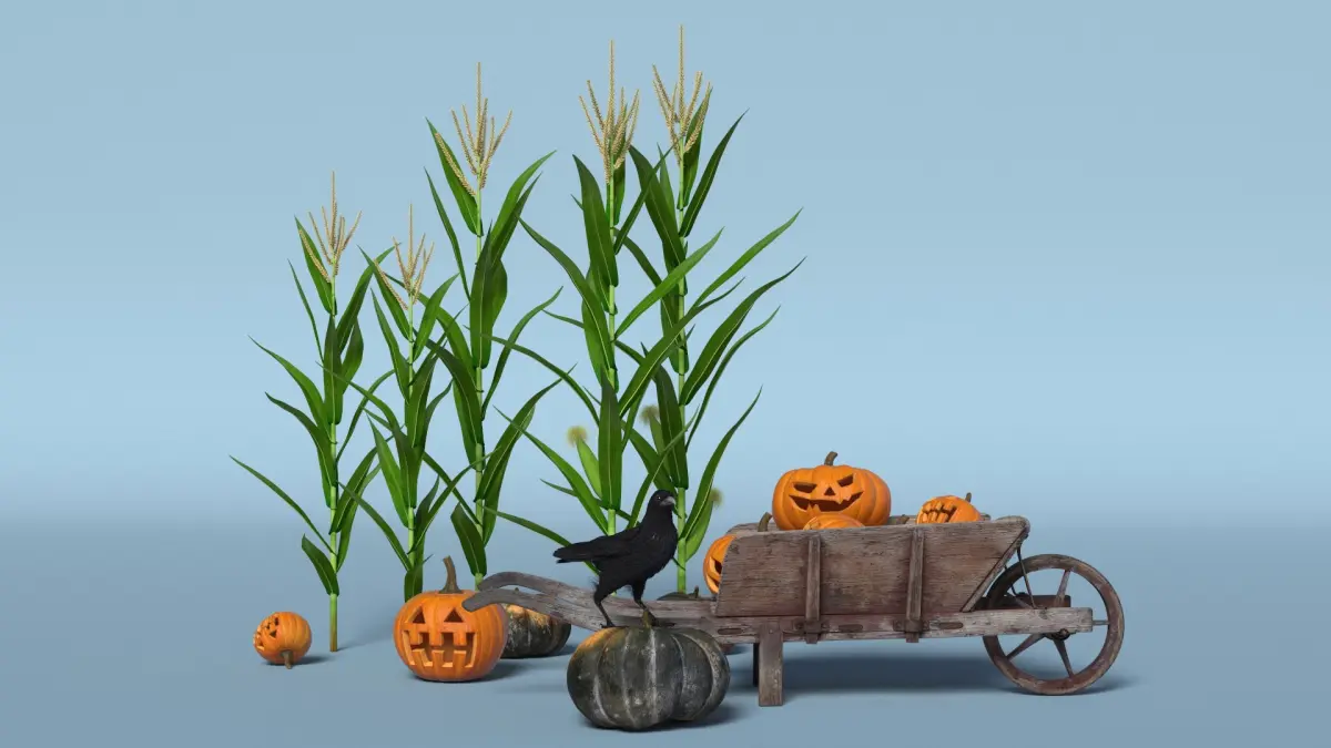 This model showcases a classic harvest scene with tall, vibrant corn plants and various pumpkins, some carved into jack-o'-lanterns. The wooden cart, rustic and aged, holds the pumpkins, while a crow adds a touch of character, symbolizing the harvest season. Halloween Carved Pumpkin with autumn-themed setup featuring corn stalks, pumpkins, a wooden cart (old wheelbarrow), and a crow.
