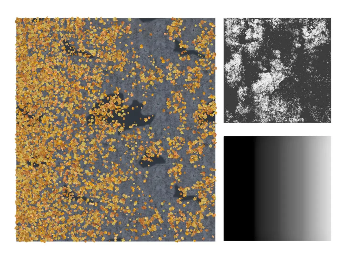 All examples (variously scattered leaves) and the asphalt with puddles showen on the render images are included.