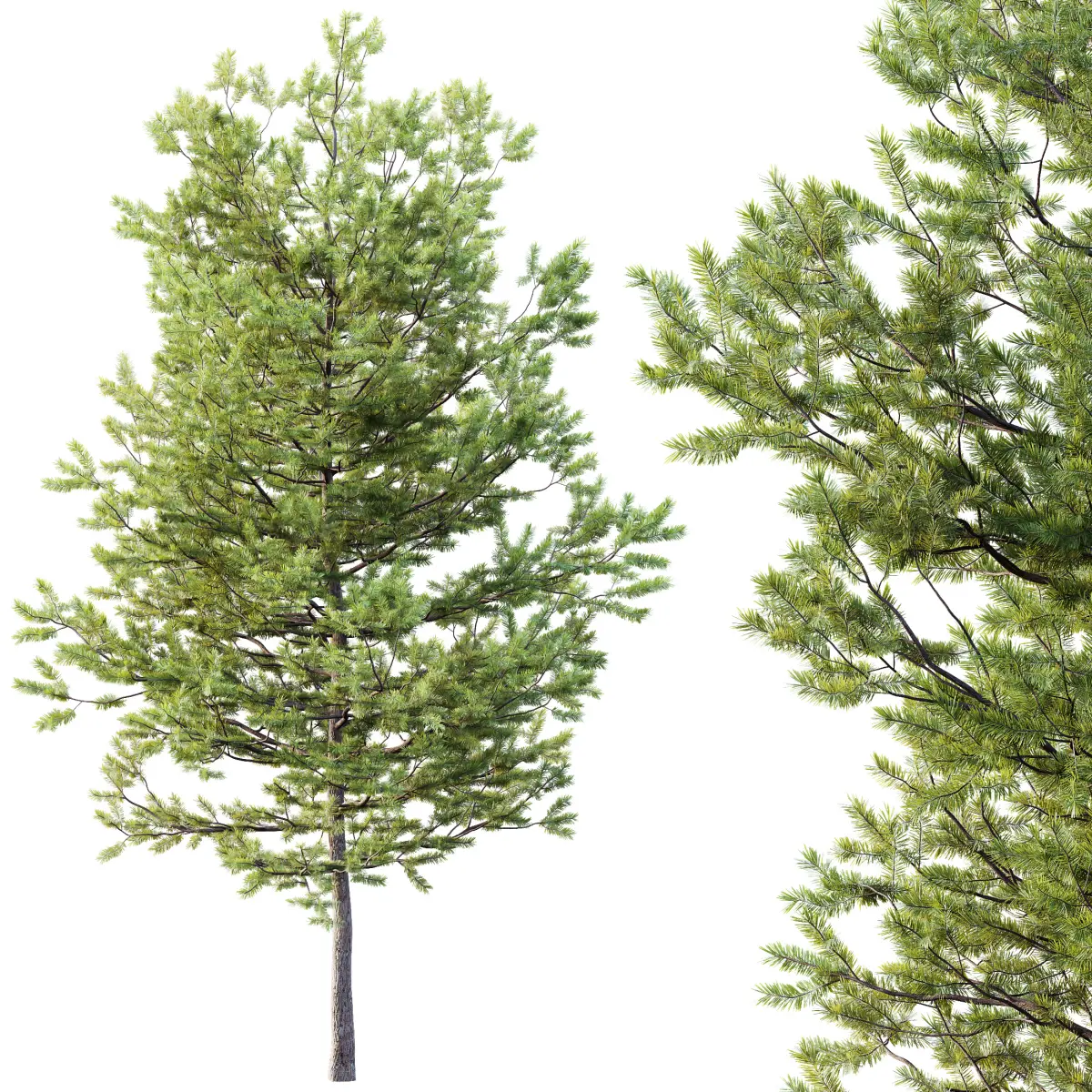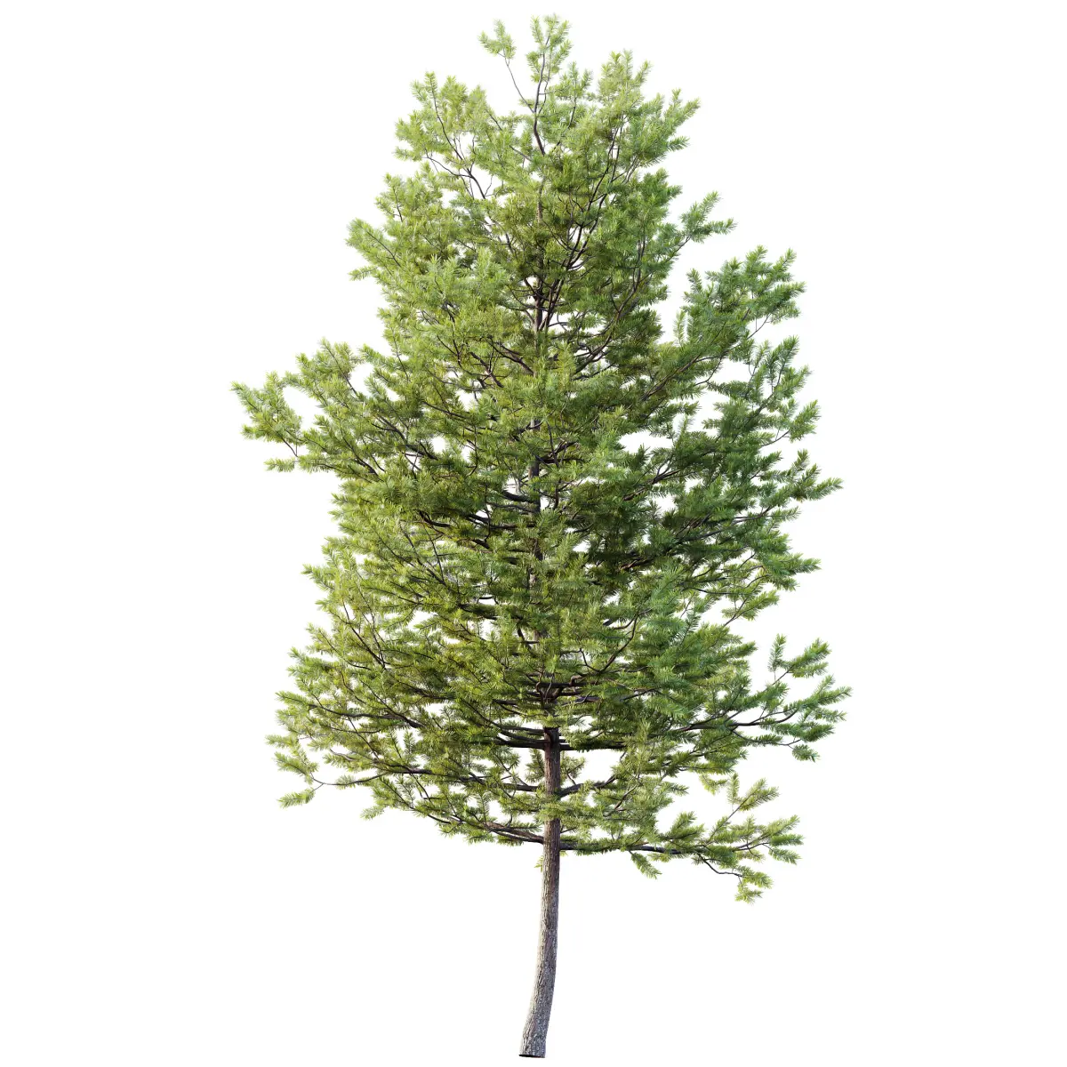 The bark is rendered in high-resolution with subtle variation and depth, while the fine needle clusters—gently asymmetrical—allow soft light interaction, making it ideal for backlighting or atmospheric exterior compositions. Every angle of this tree reflects careful attention to botanical authenticity and topological clarity.
