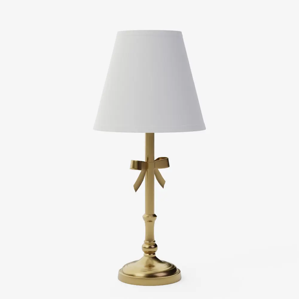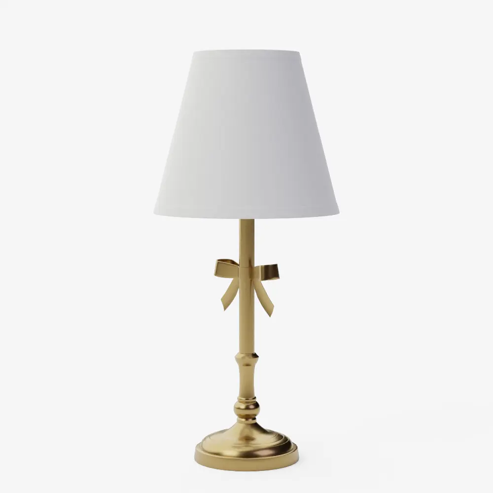 Tie their room together with this charming table lamp. It's expertly hand finished to emulate brushed gold and it comes topped with a white linen shade to cast soothing, filtered light around the room.