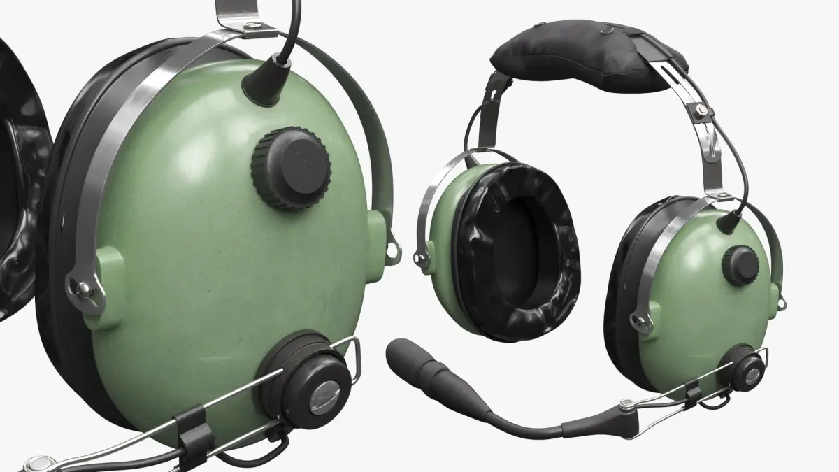 This model showcases the design of an aviation headset, complete with cushioned ear cups, a padded headband, and an adjustable microphone. The headset is designed for comfort and effective noise cancellation, essential for clear communication in the often noisy environments of aircraft cockpits.
