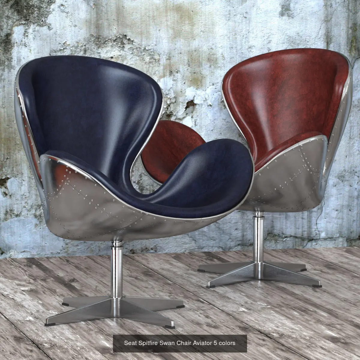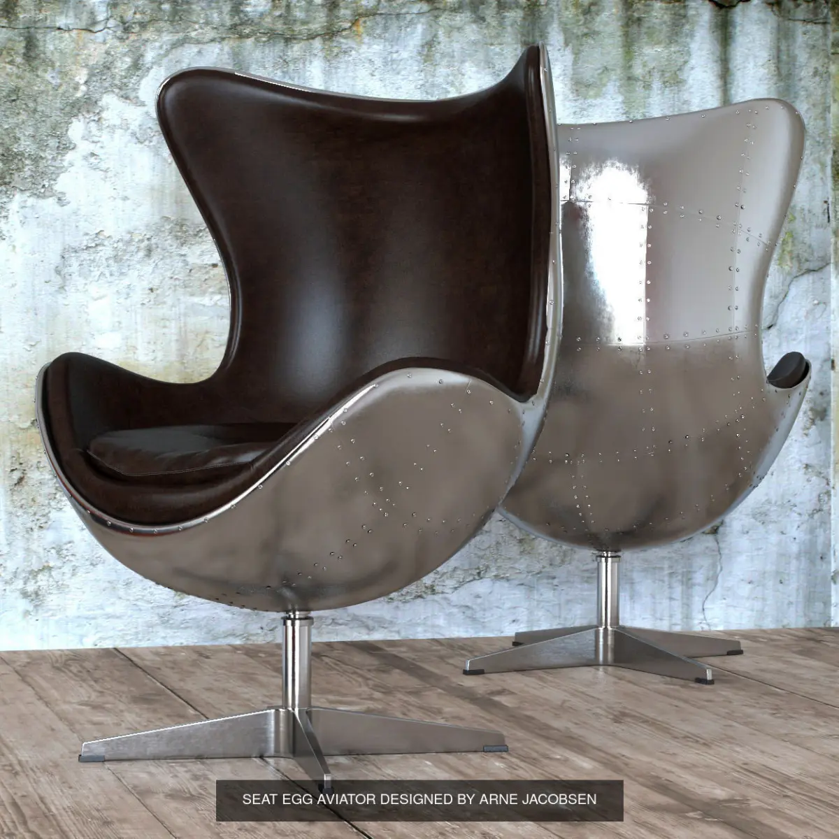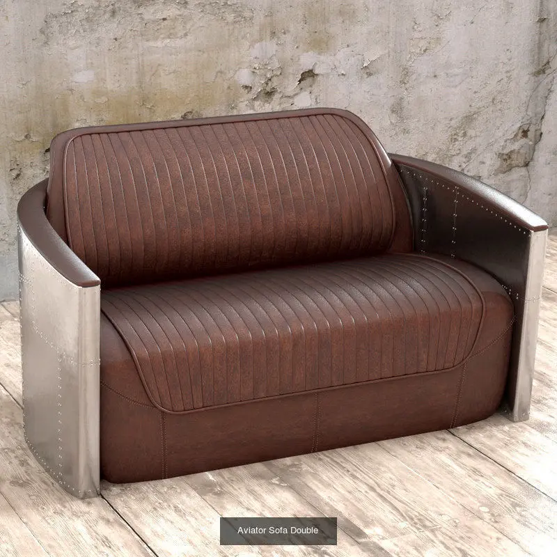 Inspired by World War II fighter planes, our furniture's aerodynamic curves are hugged in aluminum accented with exposed steel screws, the seats of the armchairs swathed in leather with the softness of a vintage bomber jacket.