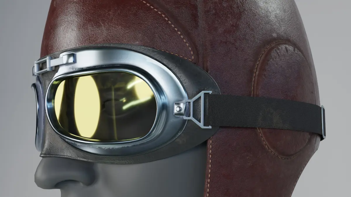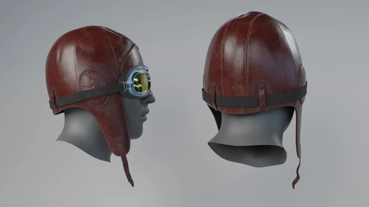 Very well optimized for game, VR/AR. A leather flying helmet, also known as an aviator hat or bomber hat, is a usually leather cap with large earflaps, a chin strap, and often a short bill that is commonly turned up at the front to show the lining. With the rise of motor sport and aviation at the start of the 1900s, leather was becoming a popular choice for protective gear from the cold and the engine noise.