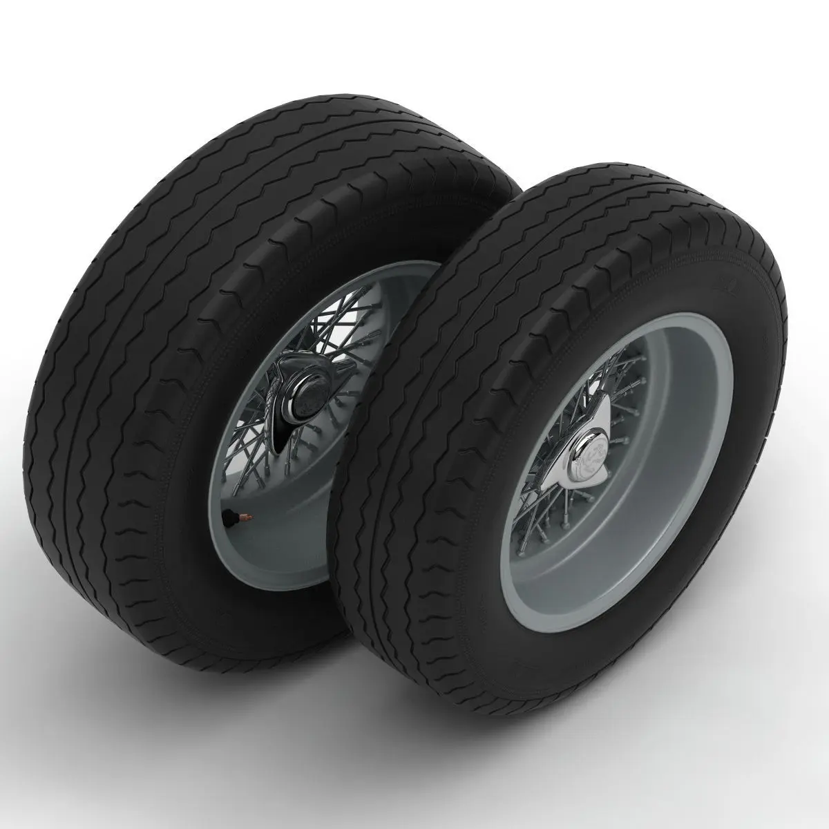 Two car wheels, front and back - Avon CR6 ZZ 6.00 L 15 (front) and 7.00 L 15 (back) tires with 15 inch Borrani rims.