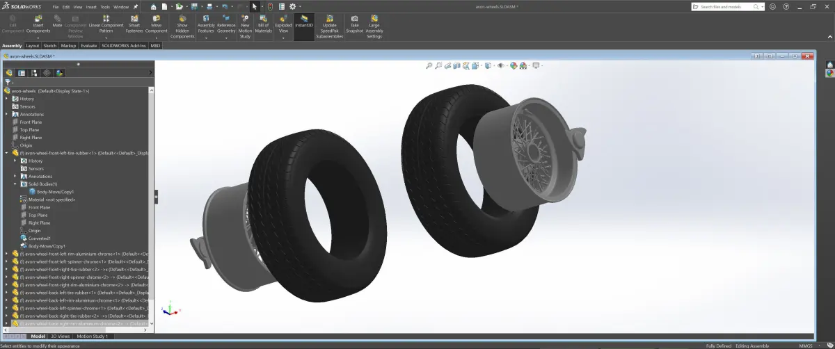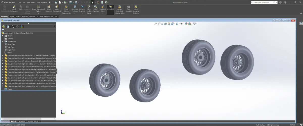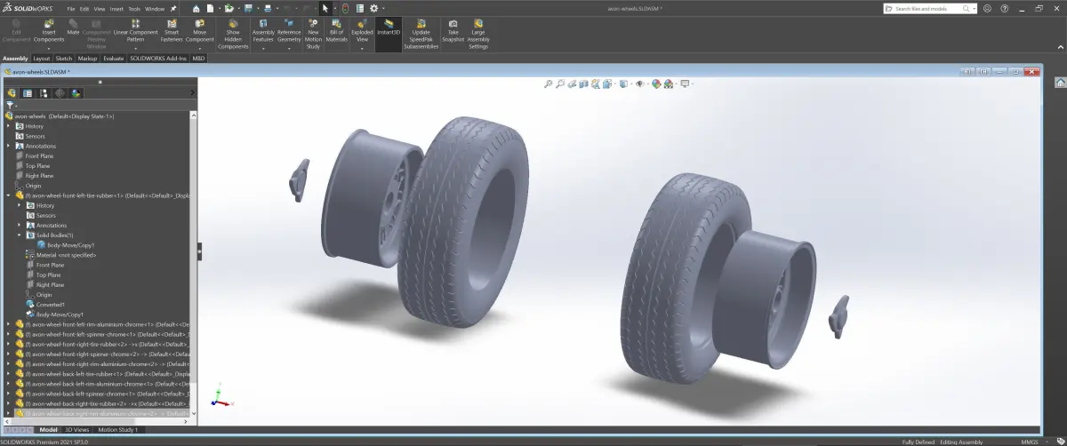 3D printable STEP, STL, PLY and Fusion 360 files included containing only the two detailed wheels, with 3 pieces each (tire, rim and spinner) and some SVG files with bumpmaps for the tire sidewalls and spinners if you want to use them for displacement (3D texture). Real-world scale, so make sure to rescale before printing.