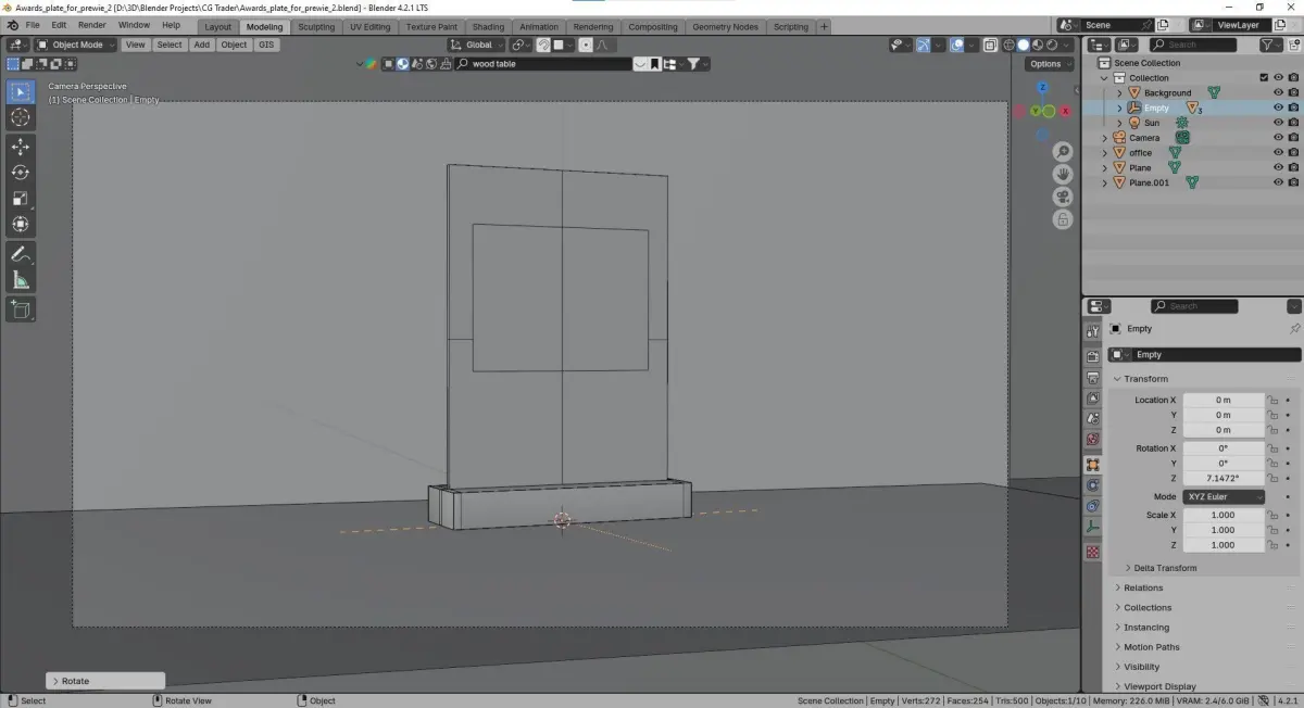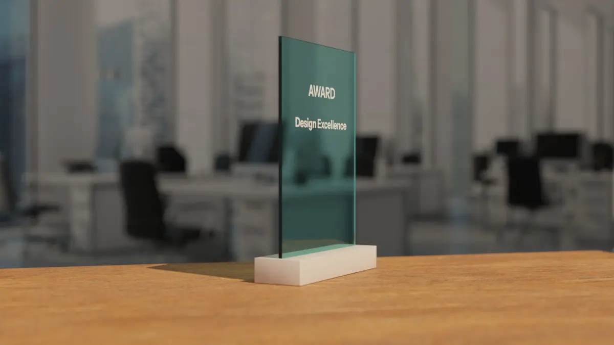 3d model of a glass AWARD plate. Blender 3D modeled and shaded. Text as meshplane, written in Figma.