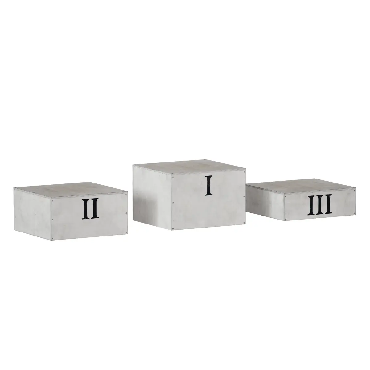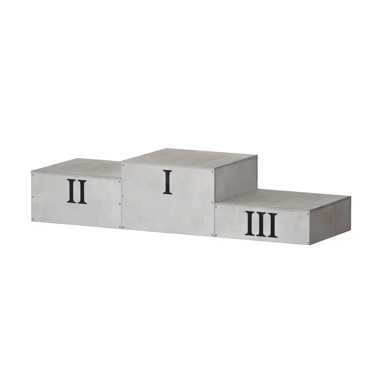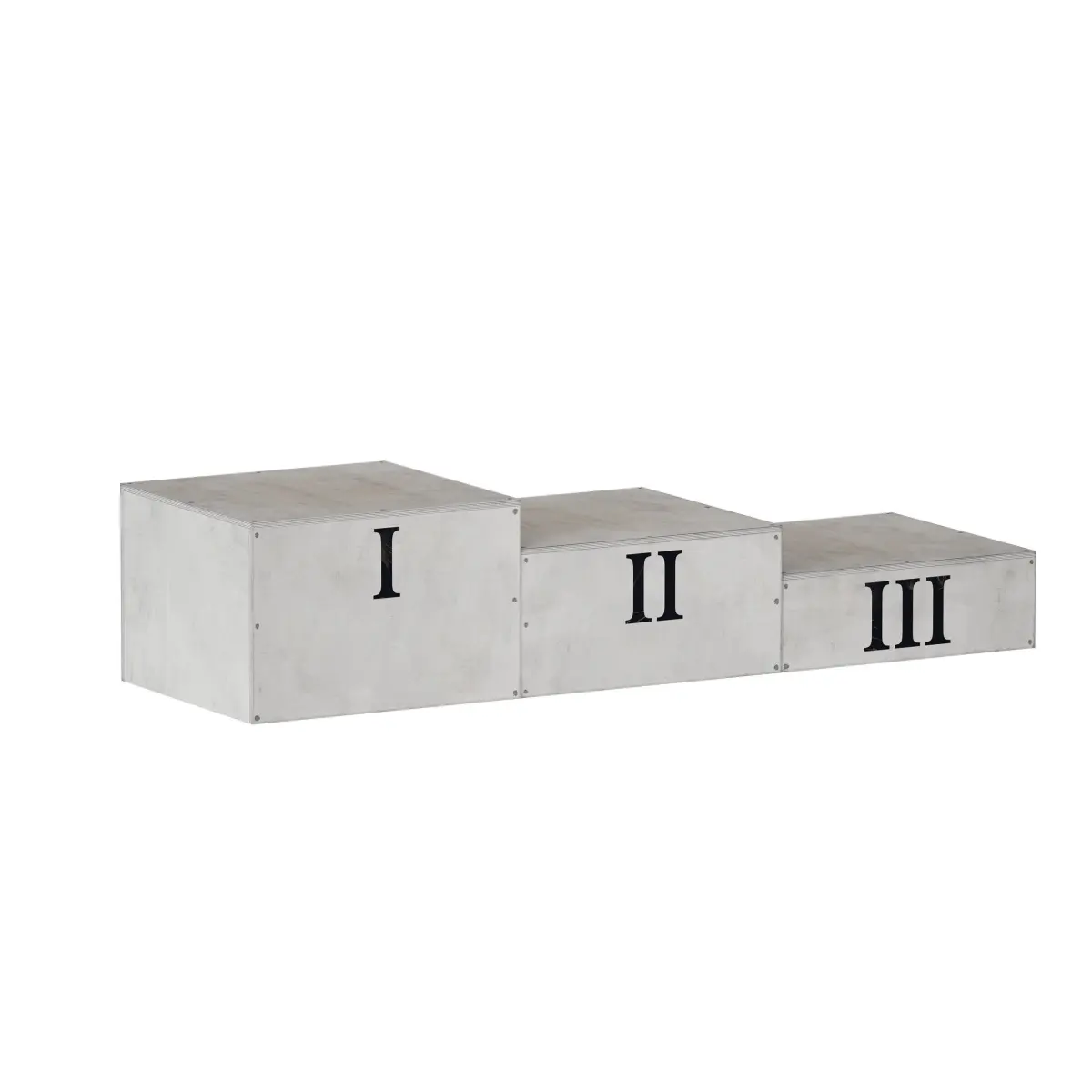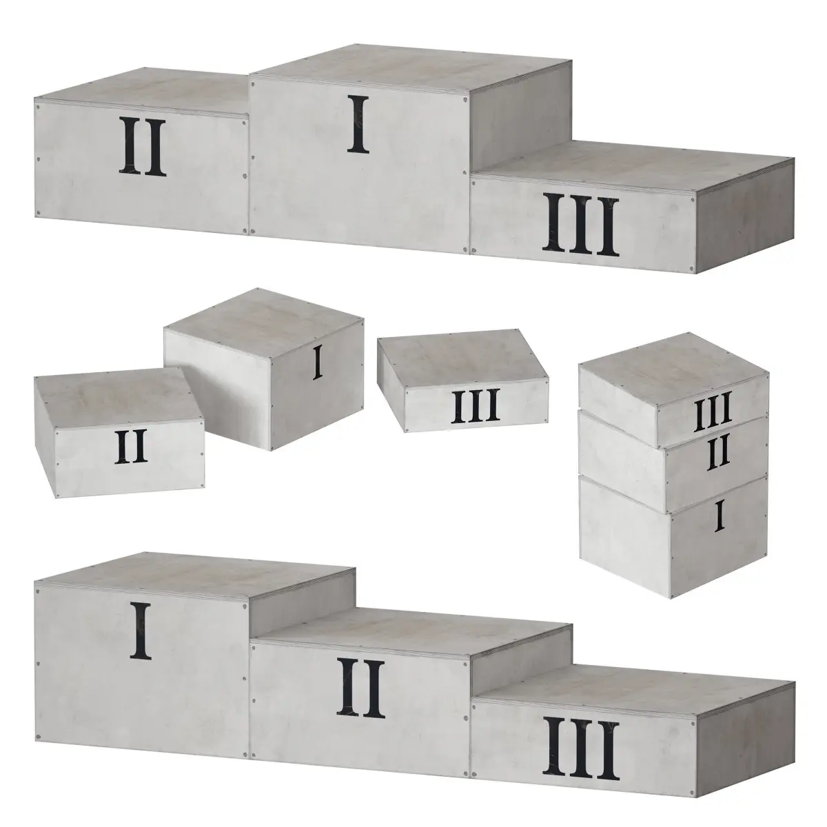 3d model of a sports award pedestal (podium). Made in the form of free-standing plywood cabinets of different heights. The design can be assembled into various compositions, it can also be used as an independent design element in the form of decor in various spaces: interiors or exteriors, in a studio, bar, nursery, etc. The cabinet is made of plywood, with traces of wear, painted with white paint, with inscriptions of Roman numerals.