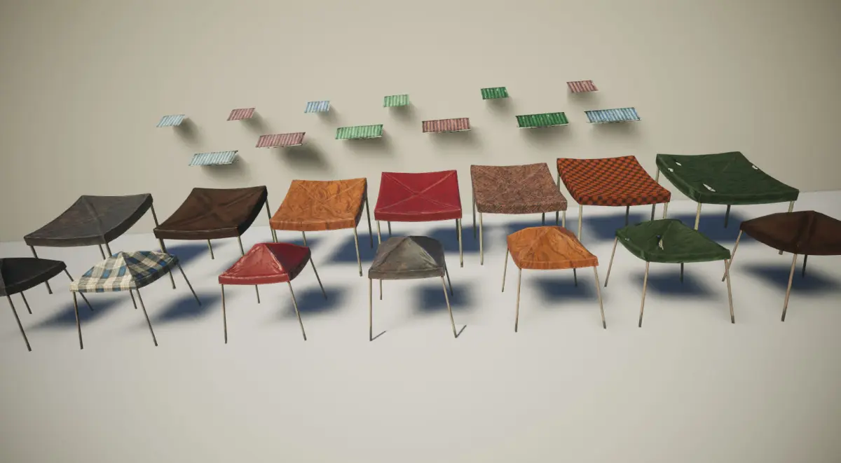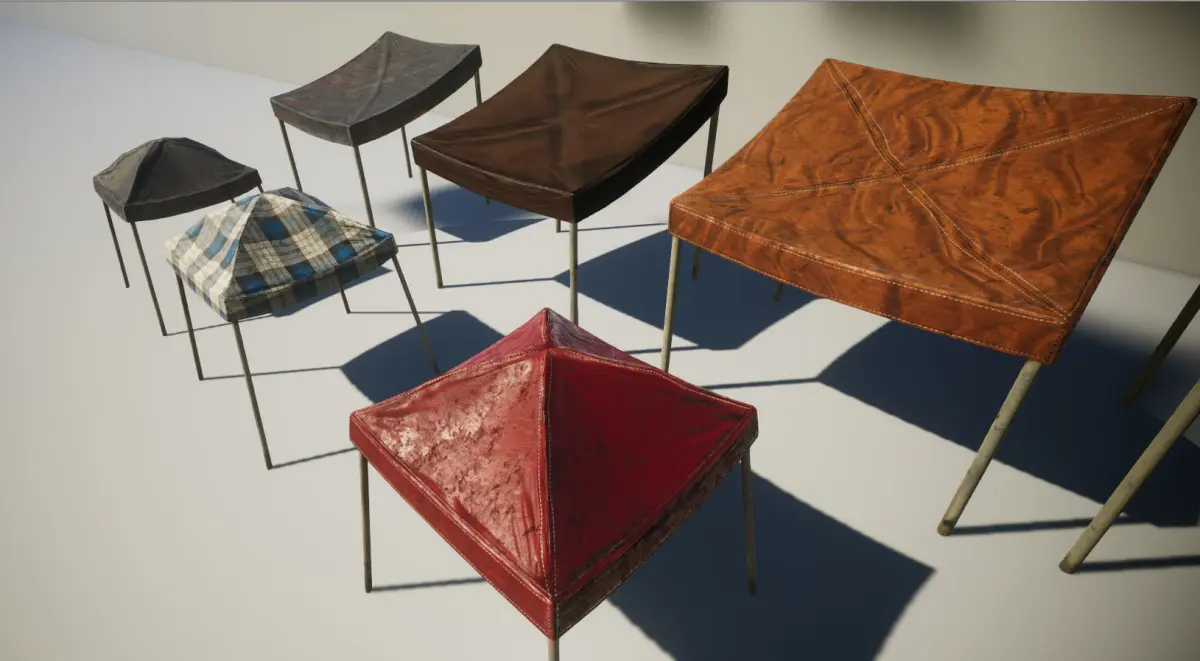 Collection of awnings and canopies with 3 LOD stages and 2 materials per model.