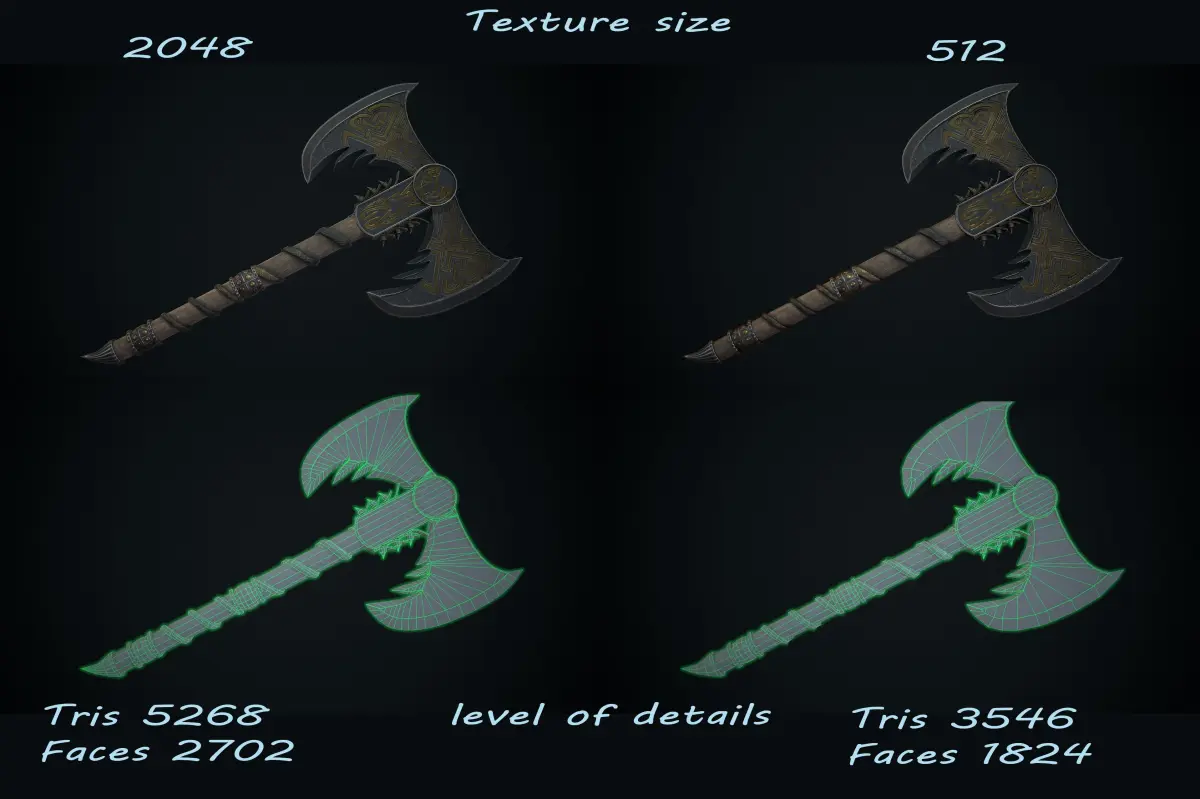 Game model.has 2 levels of detail0 LOD;Tris 5268Faces 27021 LOD;Tris 3546Faces 1824Texture size; 2048. But you can lower it to 512 without much loss