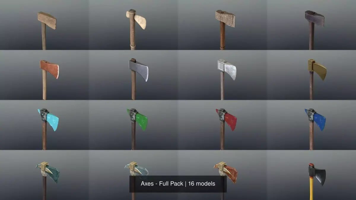 Enhance your best survival/crafting projects (game, render, advertising, design visualization, VR/AR...) with these awesome 16 high-quality pbr low-poly axes !