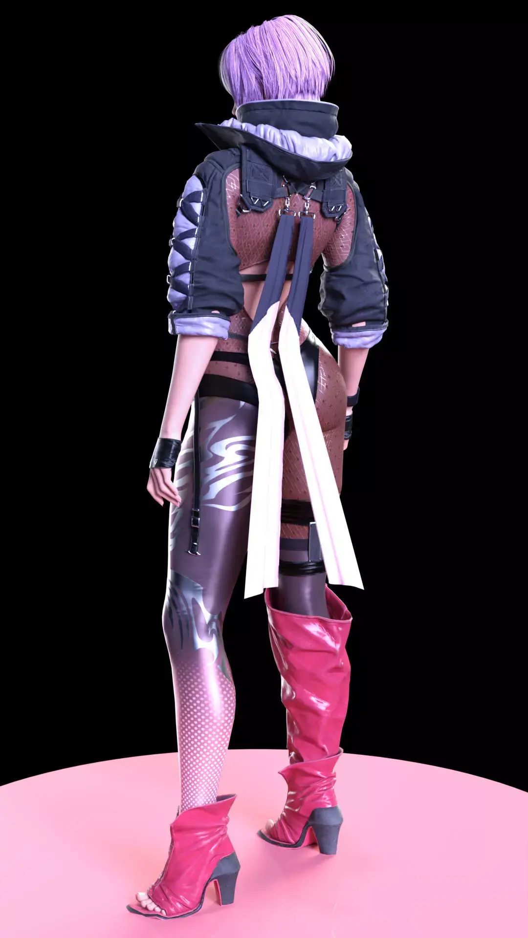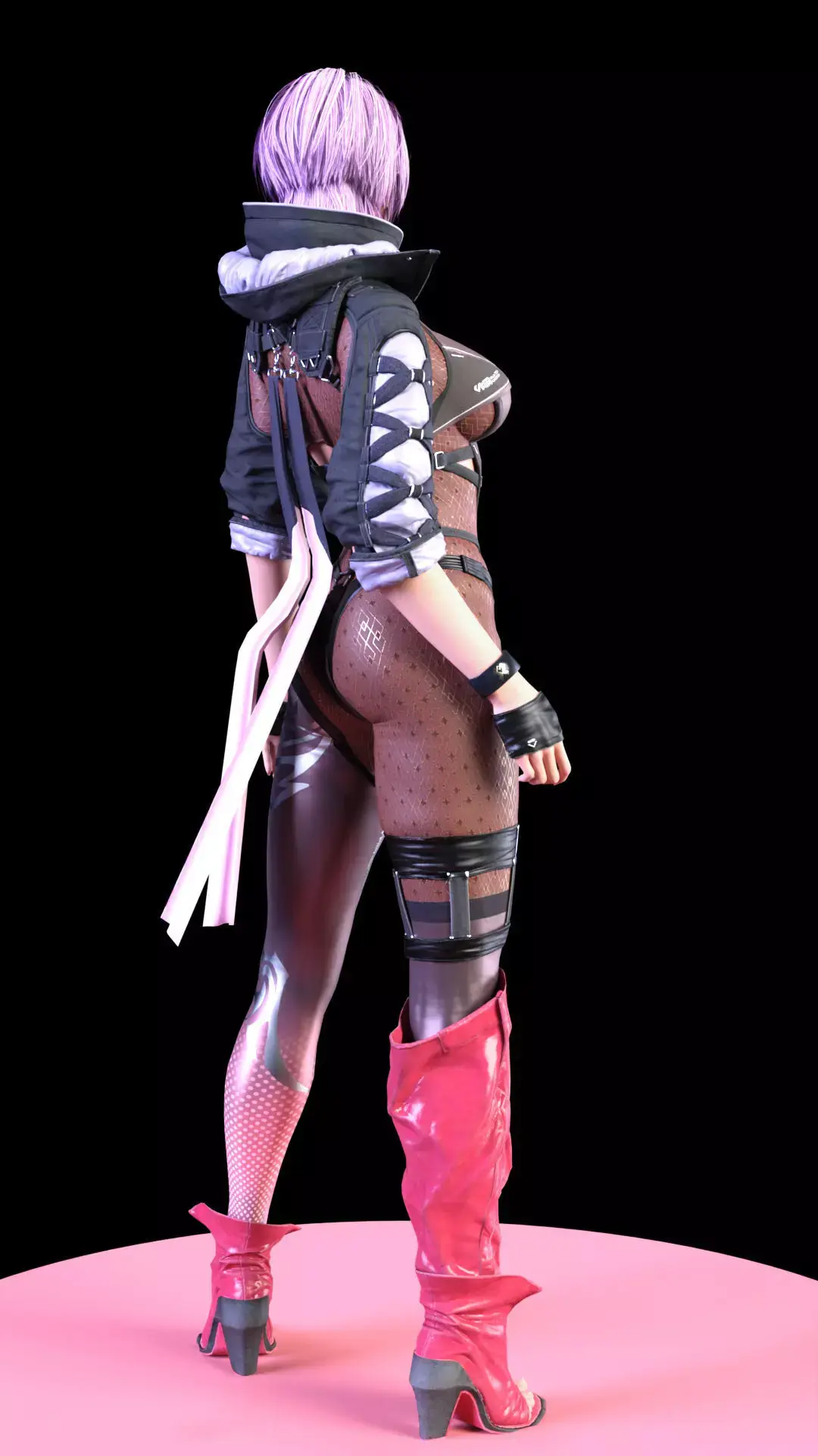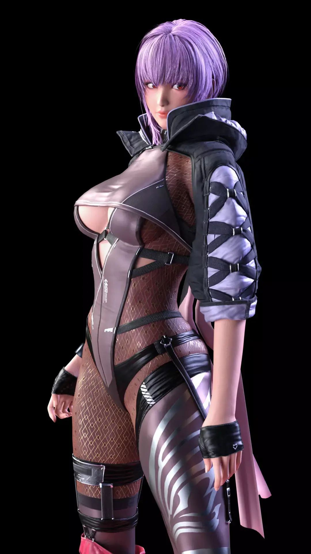A hyper-realistic 3D render of Ayane, the purple-haired ninja, presented in a highly detailed and futuristic outfit. The design combines elements of a tactical combat suit with the aesthetic of a bodysuit and fine mesh, giving her a high-tech assassin look.