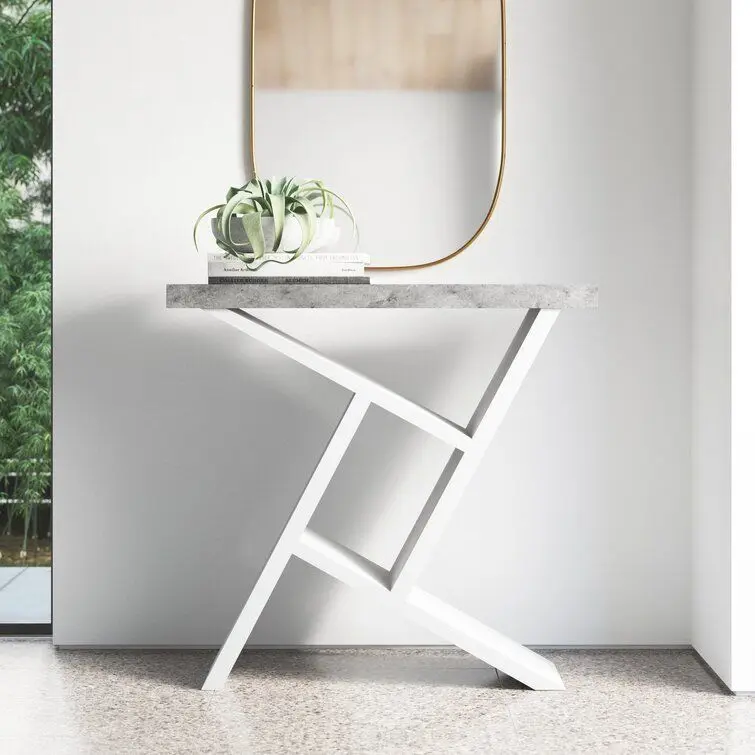 - Make a statement in your entryway with this modern rectangular console table with a unique symmetrical base. Finished on all sides in a contemporary with a spacious tabletop to display a lamp, pictures, or decorative objects.