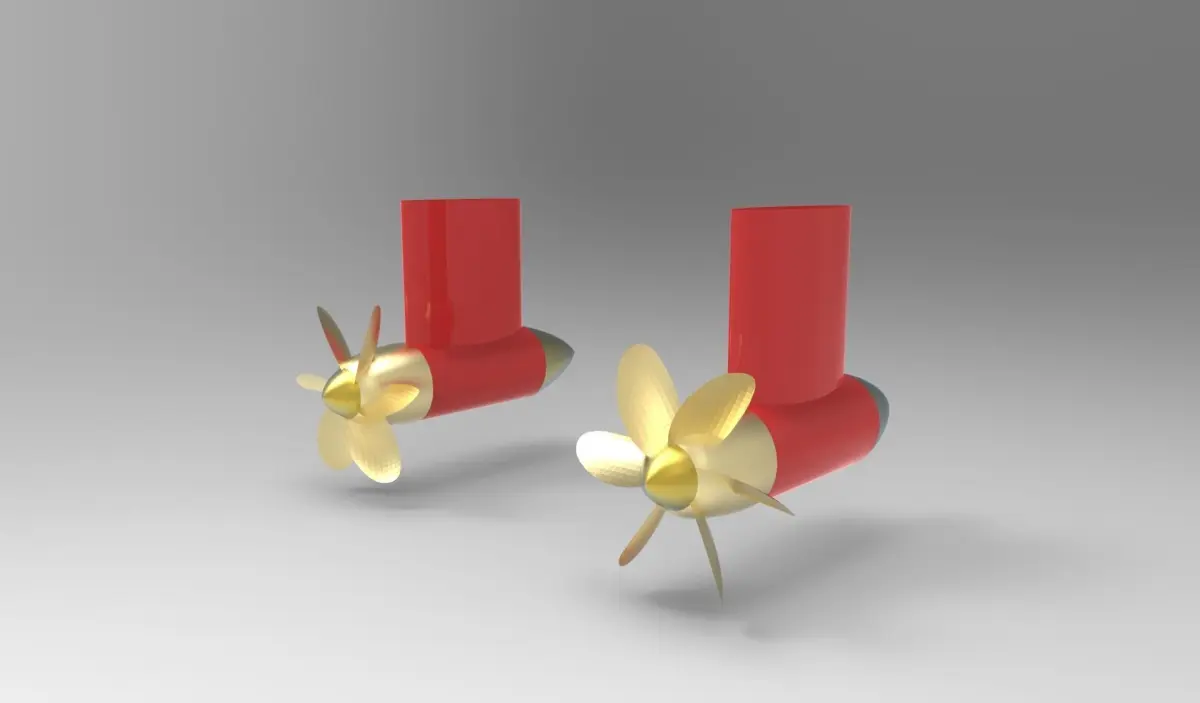 An azimuth thruster is a configuration of marine propellers placed in pods that can be rotated to any horizontal angle (azimuth), making a rudder unnecessary. These give ships better maneuverability than a fixed propeller and rudder system.