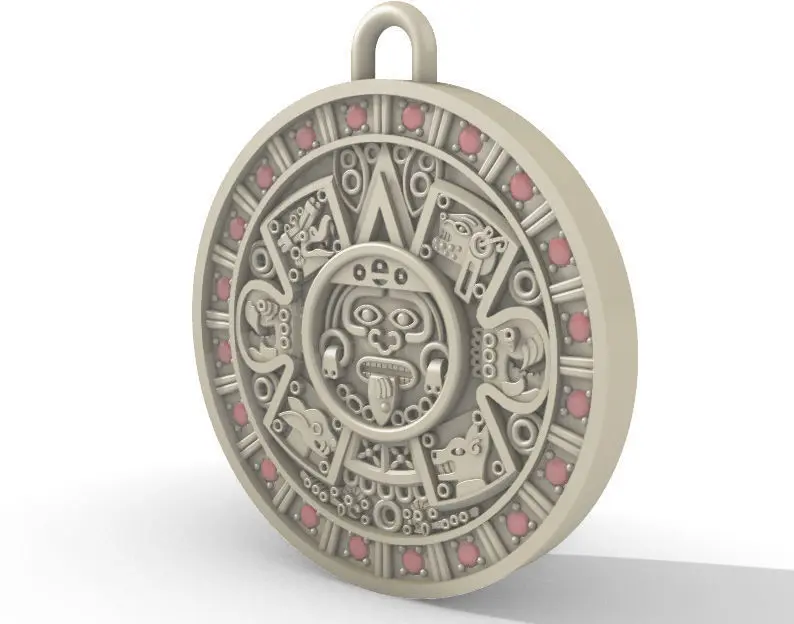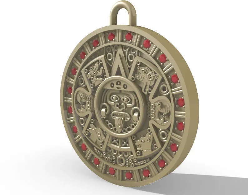 A very detailed version of the original Aztec Calendar in 3d (also known as Piedra del Sol azteca)This pendant has a diameter of 36mm and a thickness of 4mm
