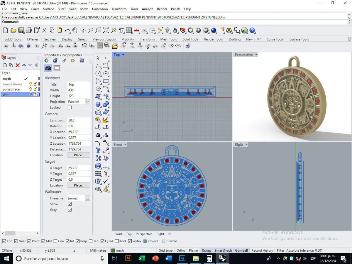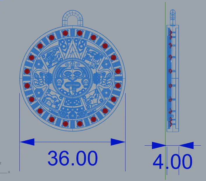 Available on files: Closed Mesh model for 3d print. [.STL .OBJ .3DS] Closed Polysurface (WaterTight Model) + Mesh of the model [.3dm] The Rhinoceros 7.0 file also contains the Aztec Calendar pendant in polysurface, in case you want to make your own design or modified / engraved your own piece.