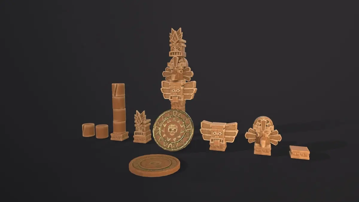 Stone hand-painted decoration for stylized game environments in Maya, Aztec, Olmec, Mesoamerica jungle, temple ruins or mountain setting.Set of low poly props for game development with 4k PNG PBR textures.Suitable for top-down, isometric, first and third person view.