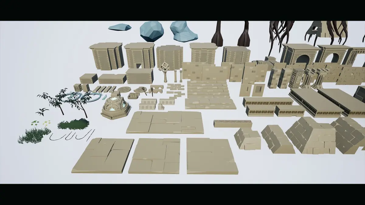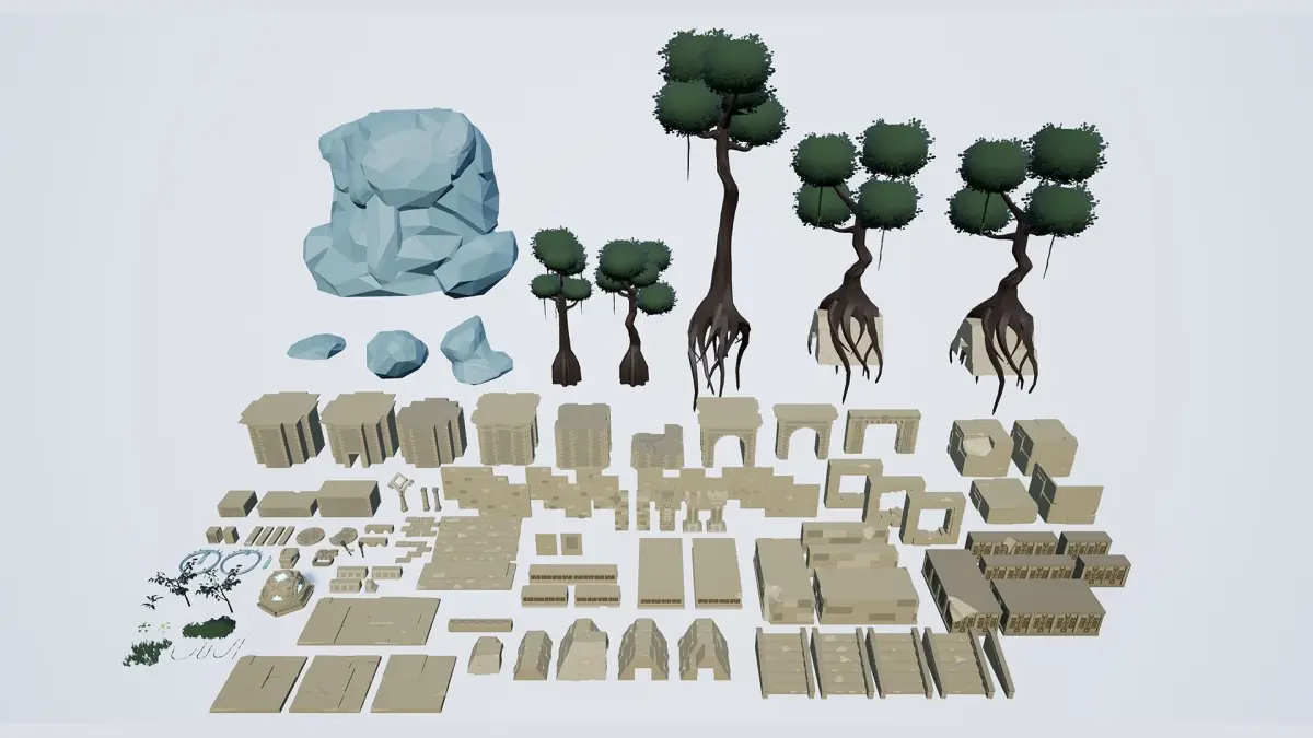 - These consist of modular temple pieces, grass, trees, moss, rocks and some animated assets.