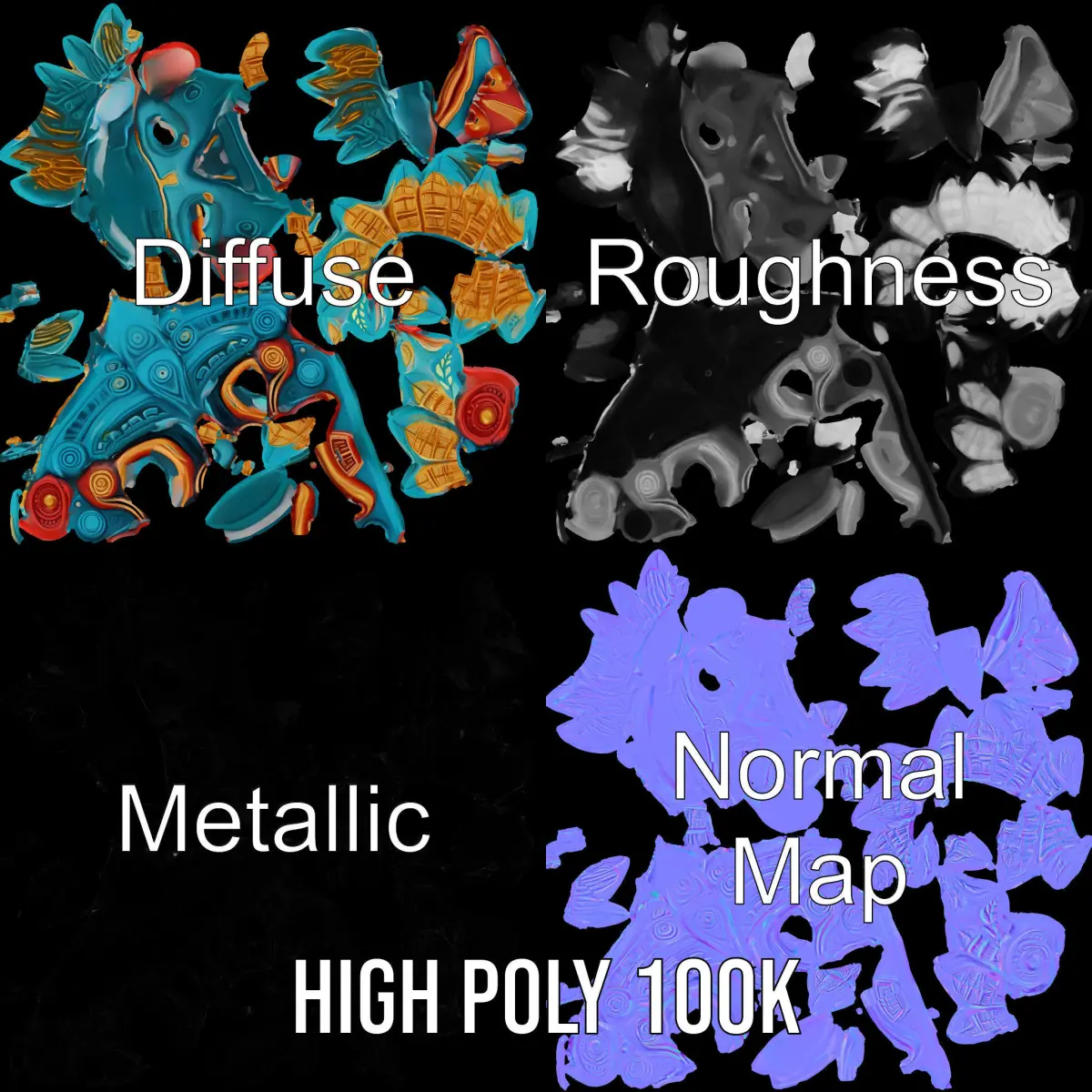 This Aztec Warrior Mask 3D model pack offers a detailed and vibrant design, perfect for historical recreations, educational displays, or themed environments. Each model has 3 levels of detail: low-poly (1000 triangles for mobile), middle-poly (10,000 triangles for environment), and high-poly (100,000 triangles), which allows for use in production rendering (such as 3ds Max, Maya, Cinema4D, Blender, Vray/Corona/Cycles and all others), game engines (Unity and Unreal compatible), and interactive presentations, providing a choice of detail based on the LOD System principle. Potential uses include cultural exhibits, virtual tours, or as a focal point in games. The model's textures are PBR, Diffuse, NormalMap, and reflection/roughness/metallic, which are suitable for any modern rendering engine. All models accurately unwrapped and have no overlapping UV. All textures are 4096*4096 in size. The first image is the reference used for creating the 3D model. It is important to carefully evaluate the quality of the model by examining the preview images that display the topology and polygonal mesh. These previews (WIRE and WEB 3D Preview) clearly demonstrate how accurately the model matches the original reference and how well the geometry has been executed. If you like the model, please leave a like and comment.