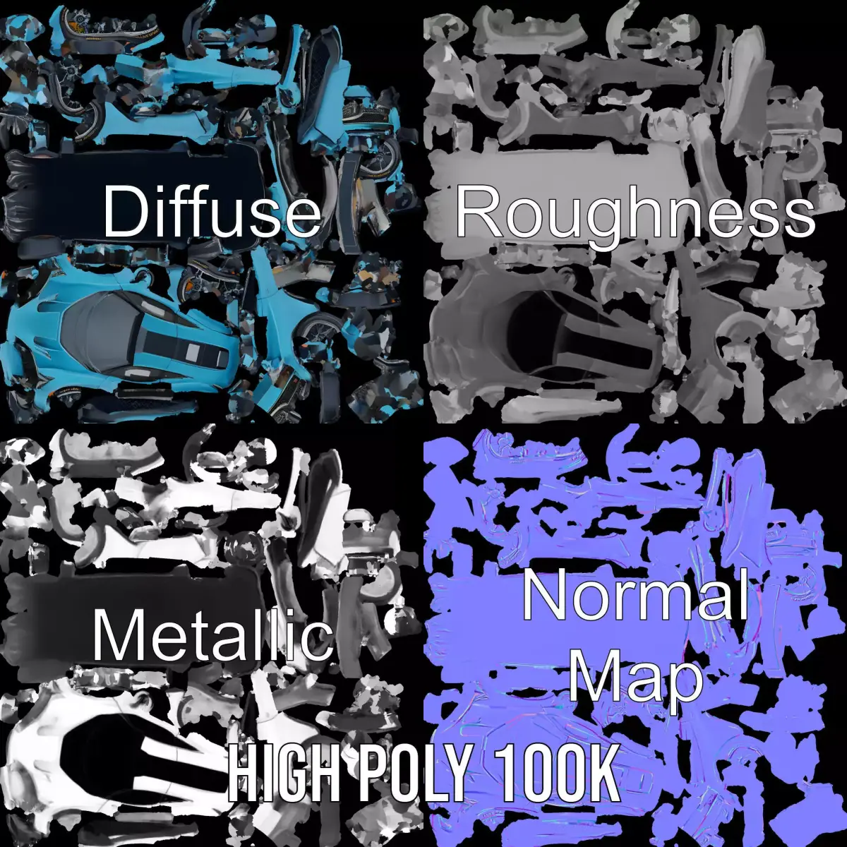 The Azure Racer model pack features a sleek, high-performance sports car design in a striking azure blue finish, perfect for automotive enthusiasts and 3D artists. Each model has 3 levels of detail: low-poly(1000 triangles for mobile), middle-poly(10,000 triangles for environment), and high-poly(100,000 triangles), which allows for the use of this model in production rendering(such as 3ds max, Maya, Cinema4d, Blender, Vray/Corona/Cycles and all other), game engines(Unity and Unreal compatible), and interactive presentations, providing a choice of detail based on the LOD System principle. Suitable for racing games, simulations, or virtual reality displays, it offers versatility and realism. The model's textures are PBR, Diffuse, NormalMap, and reflection/roughness/metallic, which are suitable for any modern rendering engine. All models are accurately unwrapped and have no overlapping UV. All textures are 4096*4096 in size. Please like and leave a comment for the model if you enjoyed it.